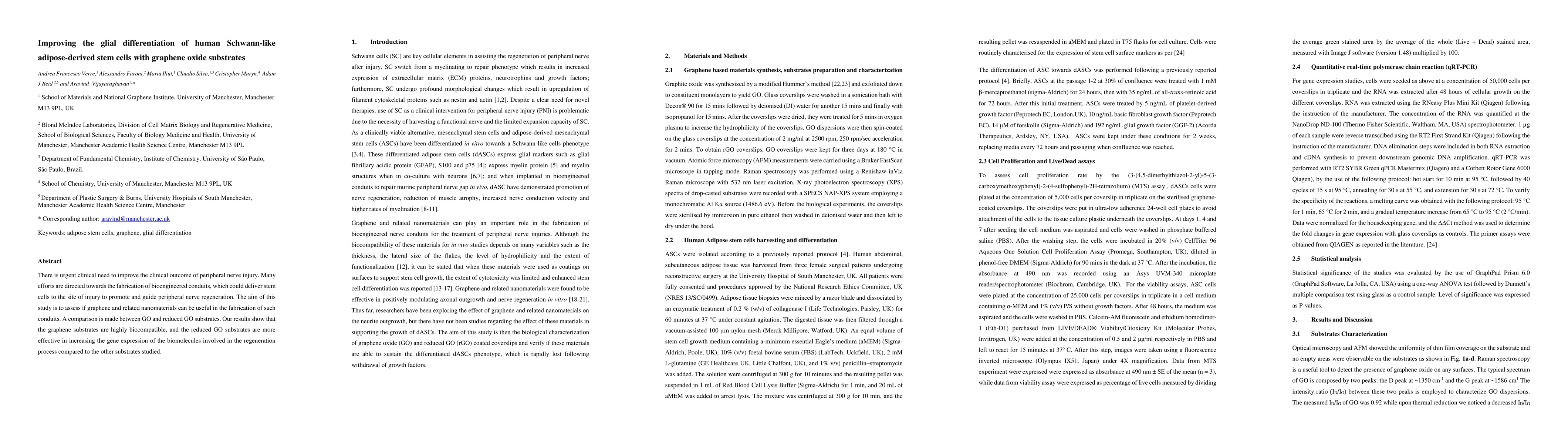 Graphene oxide substrates improve glial differentiation of human Schwann-like adipose-derived stem cells, increasing gene expression for nerve regeneration. This finding holds promise for fabricating bioengineered conduits to promote peripheral nerve healing.