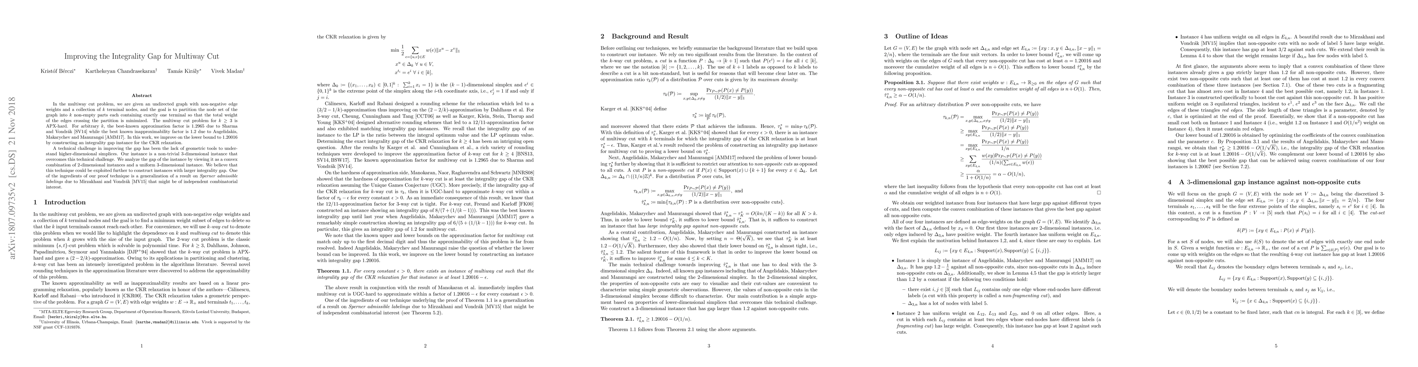 In the multiway cut problem, we are given an undirected graph with non-negative edge weights and a collection of $k$ terminal nodes, and the goal is to partition the node set of the graph into $k$ non-empty parts each containing exactly one terminal so that the total weight of the edges crossing the partition is minimized. The multiway cut problem for $k\ge 3$ is APX-hard. For arbitrary $k$, the best-known approximation factor is $1.2965$ due to [Sharma and Vondr\'{a}k, 2014] while the best known inapproximability factor is $1.2$ due to [Angelidakis, Makarychev and Manurangsi, 2017]. In this work, we improve on the lower bound to $1.20016$ by constructing an integrality gap instance for the CKR relaxation. A technical challenge in improving the gap has been the lack of geometric tools to understand higher-dimensional simplices. Our instance is a non-trivial $3$-dimensional instance that overcomes this technical challenge. We analyze the gap of the instance by viewing it as a convex combination of $2$-dimensional instances and a uniform 3-dimensional instance. We believe that this technique could be exploited further to construct instances with larger integrality gap. One of the ingredients of our proof technique is a generalization of a result on \emph{Sperner admissible labelings} due to [Mirzakhani and Vondr\'{a}k, 2015] that might be of independent combinatorial interest.