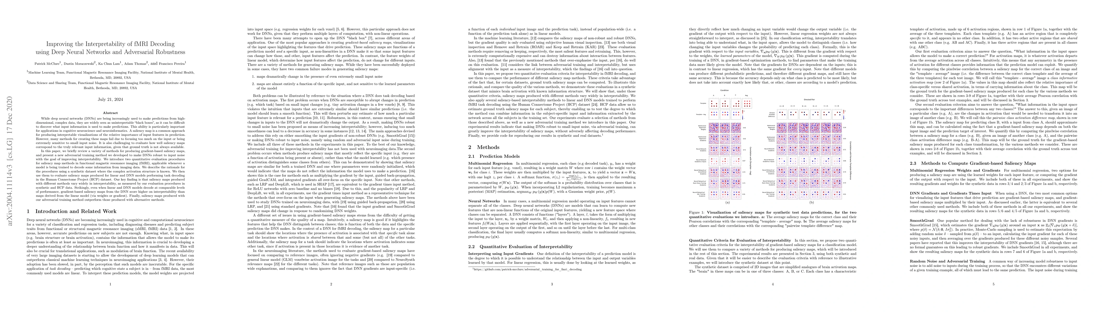 Deep neural networks (DNNs) are being increasingly used to make predictions from functional magnetic resonance imaging (fMRI) data. However, they are widely seen as uninterpretable "black boxes", as it can be difficult to discover what input information is used by the DNN in the process, something important in both cognitive neuroscience and clinical applications. A saliency map is a common approach for producing interpretable visualizations of the relative importance of input features for a prediction. However, methods for creating maps often fail due to DNNs being sensitive to input noise, or by focusing too much on the input and too little on the model. It is also challenging to evaluate how well saliency maps correspond to the truly relevant input information, as ground truth is not always available. In this paper, we review a variety of methods for producing gradient-based saliency maps, and present a new adversarial training method we developed to make DNNs robust to input noise, with the goal of improving interpretability. We introduce two quantitative evaluation procedures for saliency map methods in fMRI, applicable whenever a DNN or linear model is being trained to decode some information from imaging data. We evaluate the procedures using a synthetic dataset where the complex activation structure is known, and on saliency maps produced for DNN and linear models for task decoding in the Human Connectome Project (HCP) dataset. Our key finding is that saliency maps produced with different methods vary widely in interpretability, in both in synthetic and HCP fMRI data. Strikingly, even when DNN and linear models decode at comparable levels of performance, DNN saliency maps score higher on interpretability than linear model saliency maps (derived via weights or gradient). Finally, saliency maps produced with our adversarial training method outperform those from other methods.