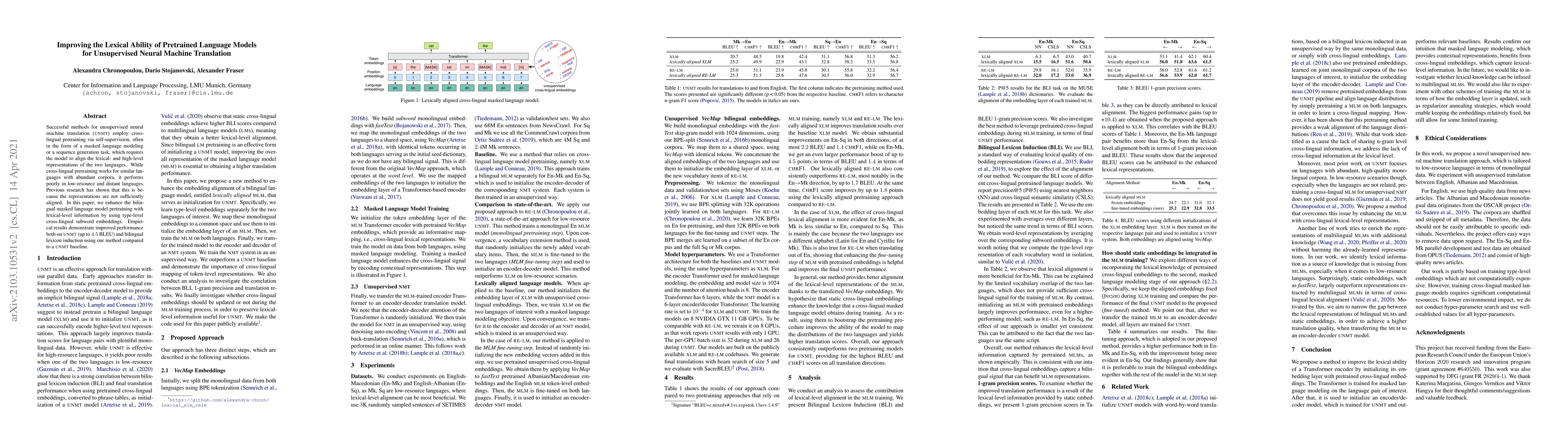 This paper proposes enhancing pretrained language models for unsupervised neural machine translation (UNMT) by incorporating lexical-level information through type-level cross-lingual subword embeddings. The results show significant improvements in UNMT performance and bilingual lexicon induction, achieving up to 4.5 BLEU score increase compared to baseline methods.