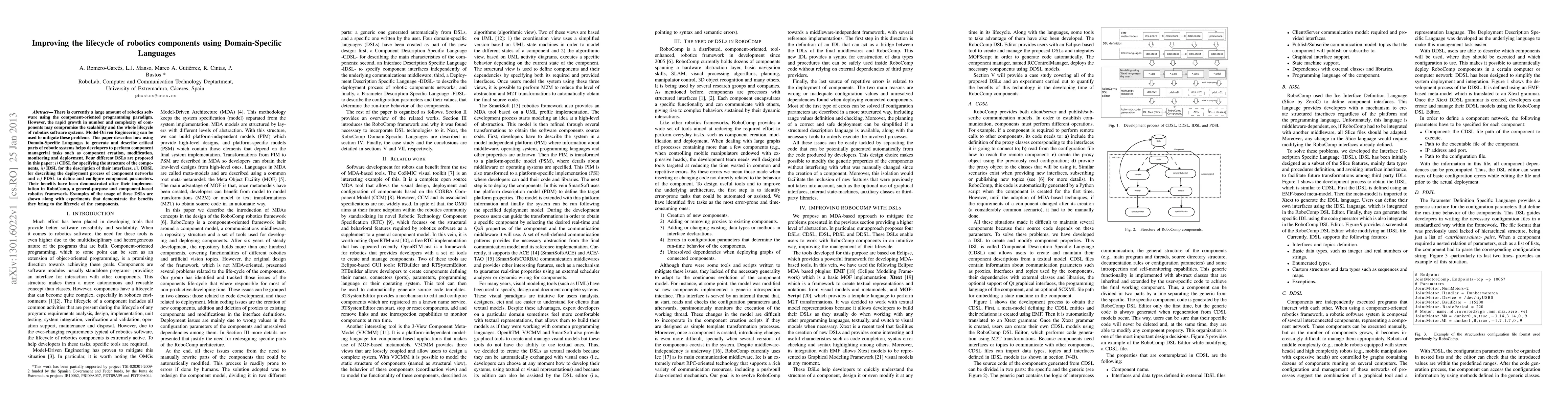 There is currently a large amount of robotics software using the component-oriented programming paradigm. However, the rapid growth in number and complexity of components may compromise the scalability and the whole lifecycle of robotics software systems. Model-Driven Engineering can be used to mitigate these problems. This paper describes how using Domain-Specific Languages to generate and describe critical parts of robotic systems helps developers to perform component managerial tasks such as component creation, modification, monitoring and deployment. Four different DSLs are proposed in this paper: i) CDSL for specifying the structure of the components, ii) IDSL for the description of their interfaces, iii) DDSL for describing the deployment process of component networks and iv) PDSL to define and configure component parameters. Their benefits have been demonstrated after their implementation in RoboComp, a general-purpose and component-based robotics framework. Examples of the usage of these DSLs are shown along with experiments that demonstrate the benefits they bring to the lifecycle of the components.