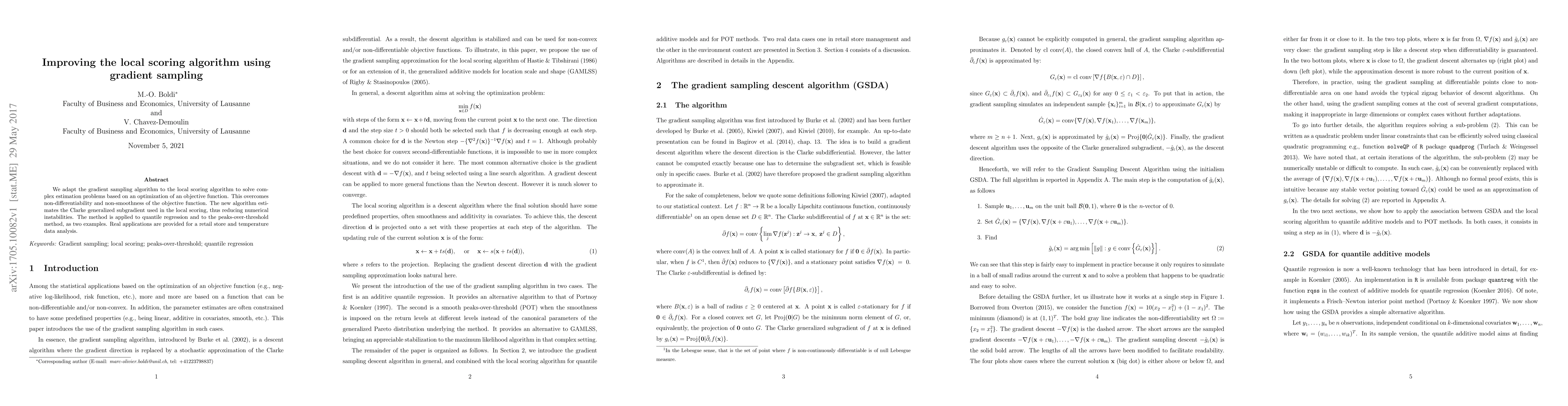 Researchers improved local scoring algorithm using gradient sampling to overcome non-differentiability and numerical instability in optimization problems. They applied the new method to quantile regression and peaks-over-threshold analysis with promising real-world results.