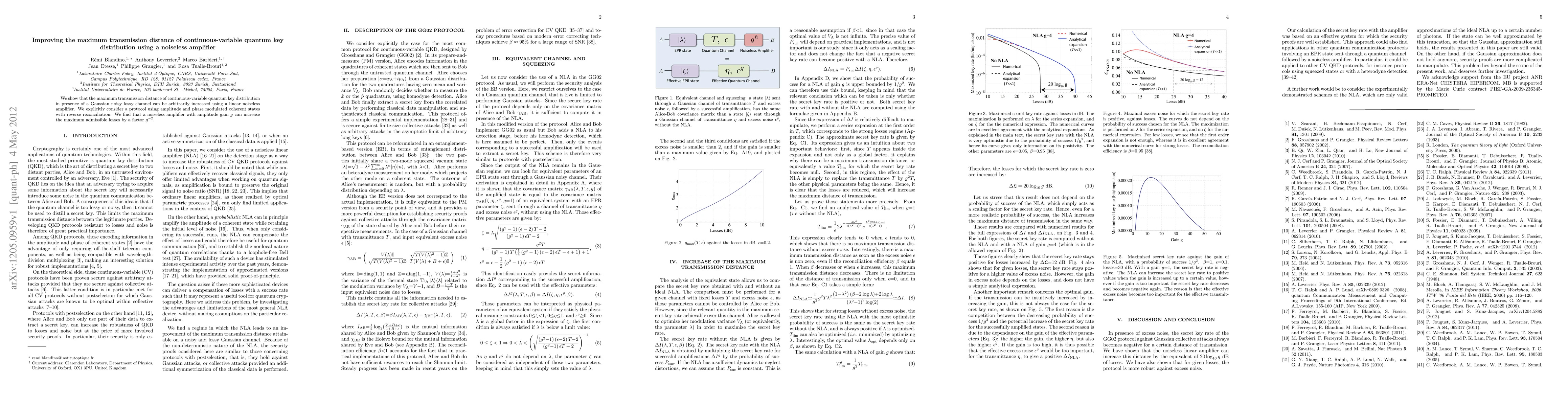 This paper demonstrates that a noiseless amplifier can significantly extend the maximum transmission distance in continuous-variable quantum key distribution by amplifying signal strength and reducing losses, increasing admissible losses by a factor of 1/g^2 with amplitude gain g.