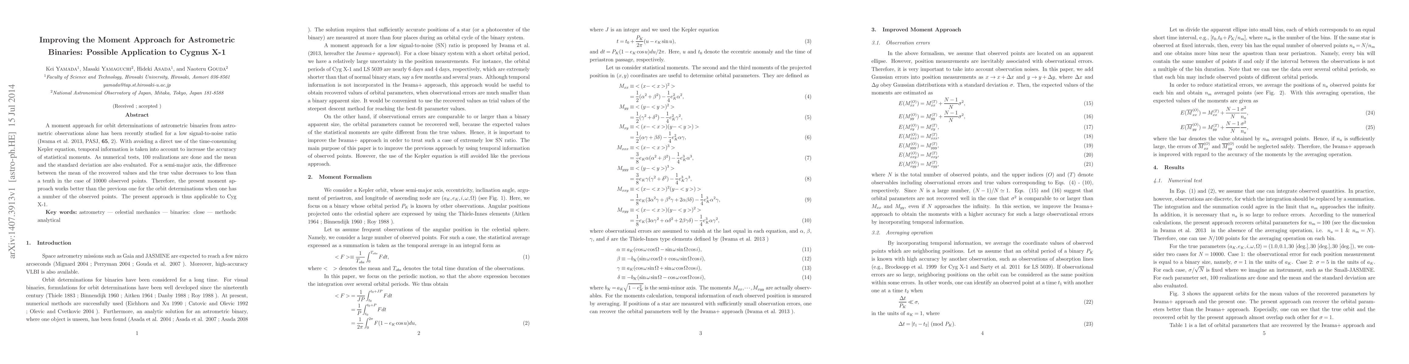 A moment approach for orbit determinations of astrometric binaries from astrometric observations alone has been recently studied for a low signal-to-noise ratio (Iwama et al. 2013, PASJ, 65, 2). With avoiding a direct use of the time-consuming Kepler equation, temporal information is taken into account to increase the accuracy of statistical moments. As numerical tests, 100 realizations are done and the mean and the standard deviation are also evaluated. For a semi-major axis, the difference between the mean of the recovered values and the true value decreases to less than a tenth in the case of $10000$ observed points. Therefore, the present moment approach works better than the previous one for the orbit determinations when one has a number of the observed points. The present approach is thus applicable to Cyg X-1.