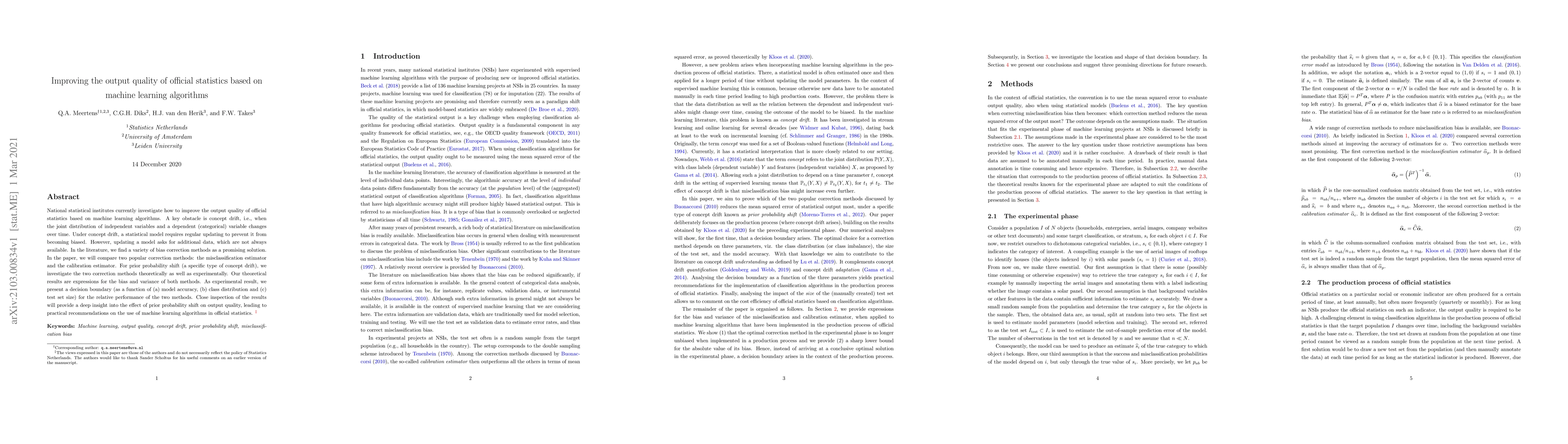 This paper investigates methods to improve the output quality of official statistics using machine learning, focusing on addressing concept drift through bias correction. It compares the misclassification estimator and calibration estimator, providing theoretical expressions for their bias and variance and presenting experimental results on their relative performance under prior probability shift.