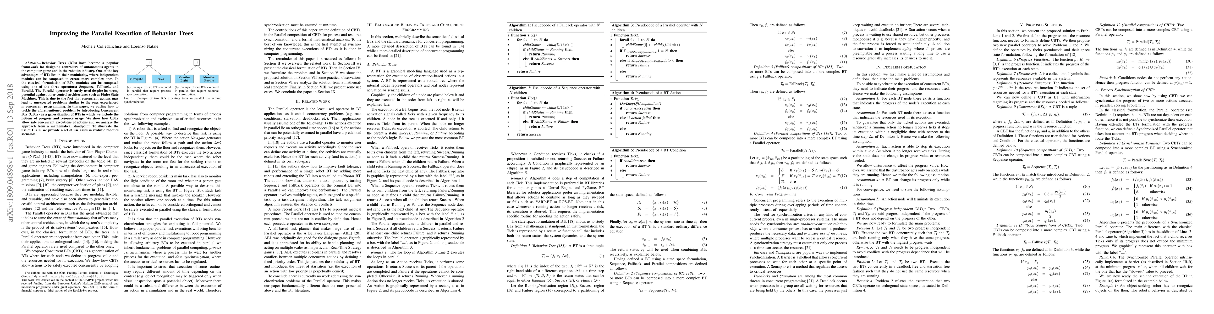 Behavior Trees (BTs) have become a popular framework for designing controllers of autonomous agents in the computer game and in the robotics industry. One of the key advantages of BTs lies in their modularity, where independent modules can be composed to create more complex ones. In the classical formulation of BTs, modules can be composed using one of the three operators: Sequence, Fallback, and Parallel. The Parallel operator is rarely used despite its strong potential against other control architectures as Finite State Machines. This is due to the fact that concurrent actions may lead to unexpected problems similar to the ones experienced in concurrent programming. In this paper, we introduce Concurrent BTs (CBTs) as a generalization of BTs in which we introduce the notions of progress and resource usage. We show how CBTs allow safe concurrent executions of actions and we analyze the approach from a mathematical standpoint. To illustrate the use of CBTs, we provide a set of use cases in robotics scenarios.