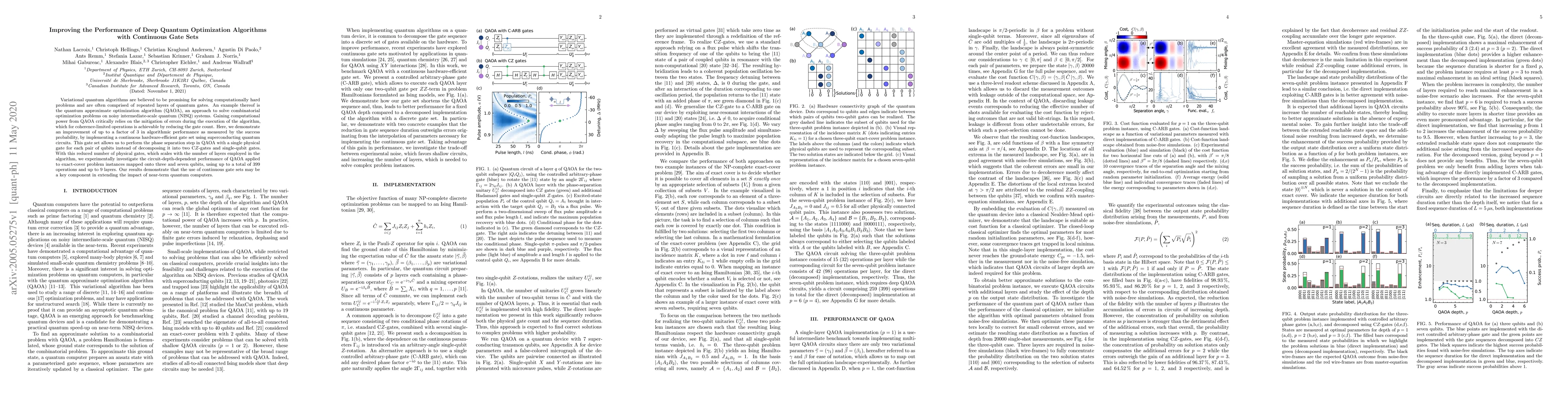 Variational quantum algorithms are believed to be promising for solving computationally hard problems and are often comprised of repeated layers of quantum gates. An example thereof is the quantum approximate optimization algorithm (QAOA), an approach to solve combinatorial optimization problems on noisy intermediate-scale quantum (NISQ) systems. Gaining computational power from QAOA critically relies on the mitigation of errors during the execution of the algorithm, which for coherence-limited operations is achievable by reducing the gate count. Here, we demonstrate an improvement of up to a factor of 3 in algorithmic performance as measured by the success probability, by implementing a continuous hardware-efficient gate set using superconducting quantum circuits. This gate set allows us to perform the phase separation step in QAOA with a single physical gate for each pair of qubits instead of decomposing it into two C$Z$-gates and single-qubit gates. With this reduced number of physical gates, which scales with the number of layers employed in the algorithm, we experimentally investigate the circuit-depth-dependent performance of QAOA applied to exact-cover problem instances mapped onto three and seven qubits, using up to a total of 399 operations and up to 9 layers. Our results demonstrate that the use of continuous gate sets may be a key component in extending the impact of near-term quantum computers.