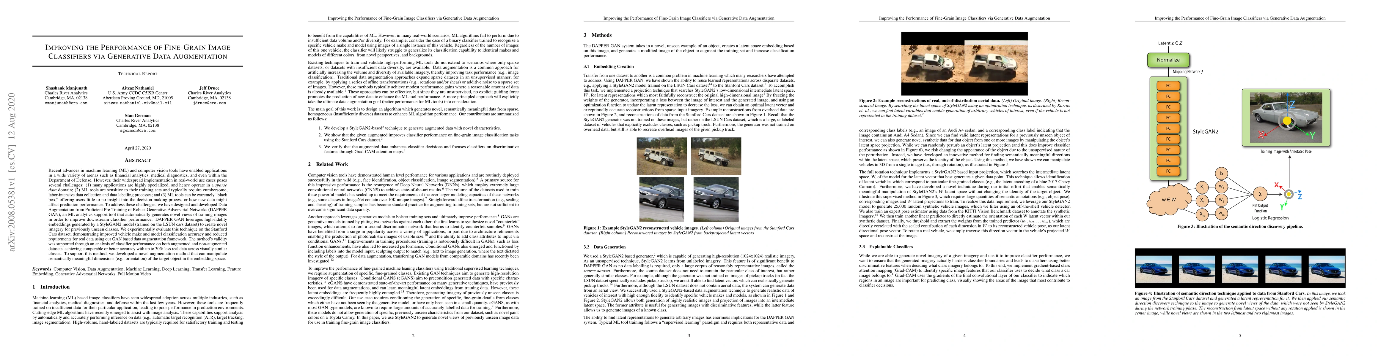 Recent advances in machine learning (ML) and computer vision tools have enabled applications in a wide variety of arenas such as financial analytics, medical diagnostics, and even within the Department of Defense. However, their widespread implementation in real-world use cases poses several challenges: (1) many applications are highly specialized, and hence operate in a \emph{sparse data} domain; (2) ML tools are sensitive to their training sets and typically require cumbersome, labor-intensive data collection and data labelling processes; and (3) ML tools can be extremely "black box," offering users little to no insight into the decision-making process or how new data might affect prediction performance. To address these challenges, we have designed and developed Data Augmentation from Proficient Pre-Training of Robust Generative Adversarial Networks (DAPPER GAN), an ML analytics support tool that automatically generates novel views of training images in order to improve downstream classifier performance. DAPPER GAN leverages high-fidelity embeddings generated by a StyleGAN2 model (trained on the LSUN cars dataset) to create novel imagery for previously unseen classes. We experimentally evaluate this technique on the Stanford Cars dataset, demonstrating improved vehicle make and model classification accuracy and reduced requirements for real data using our GAN based data augmentation framework. The method's validity was supported through an analysis of classifier performance on both augmented and non-augmented datasets, achieving comparable or better accuracy with up to 30\% less real data across visually similar classes. To support this method, we developed a novel augmentation method that can manipulate semantically meaningful dimensions (e.g., orientation) of the target object in the embedding space.
