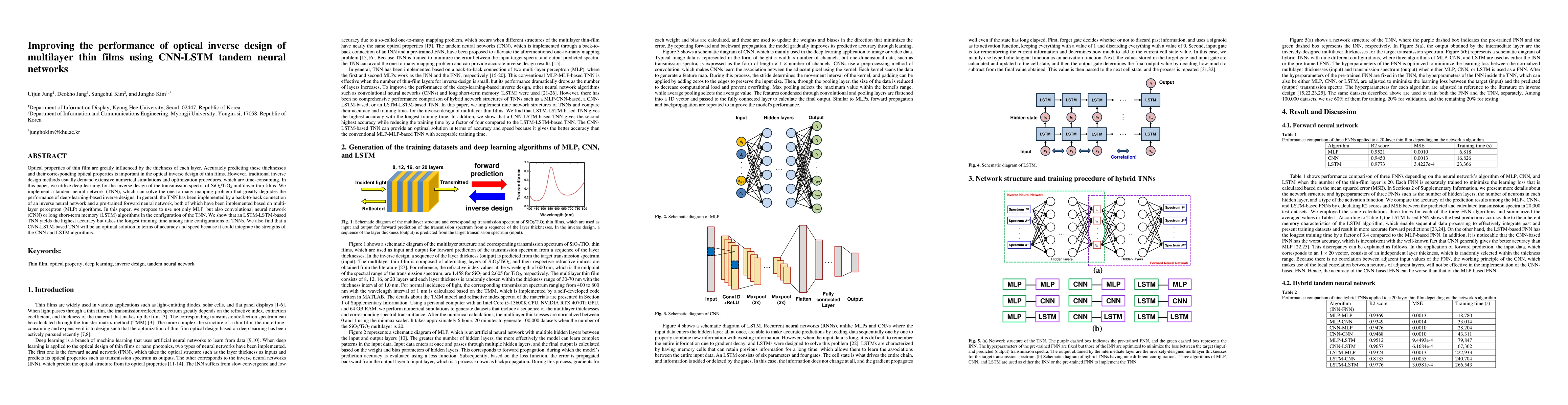 This paper uses a tandem neural network to improve the accuracy of optical inverse design for multilayer thin films, achieving better results with an LSTM-LSTM-based configuration while balancing speed and performance.