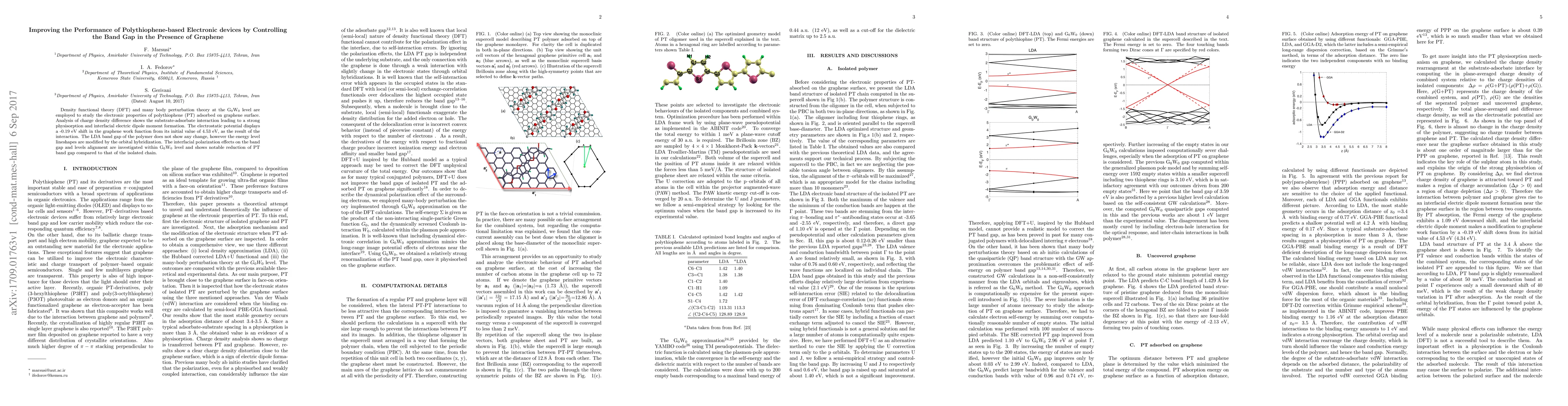 This paper investigates the electronic properties of polythiophene on graphene using DFT and G$_0$W$_0$ theory, revealing strong physisorption and a -0.19 eV shift in graphene's work function. The study shows that while the polymer's LDA band gap remains unchanged, orbital hybridization reduces the polythiophene band gap, enhancing device performance.