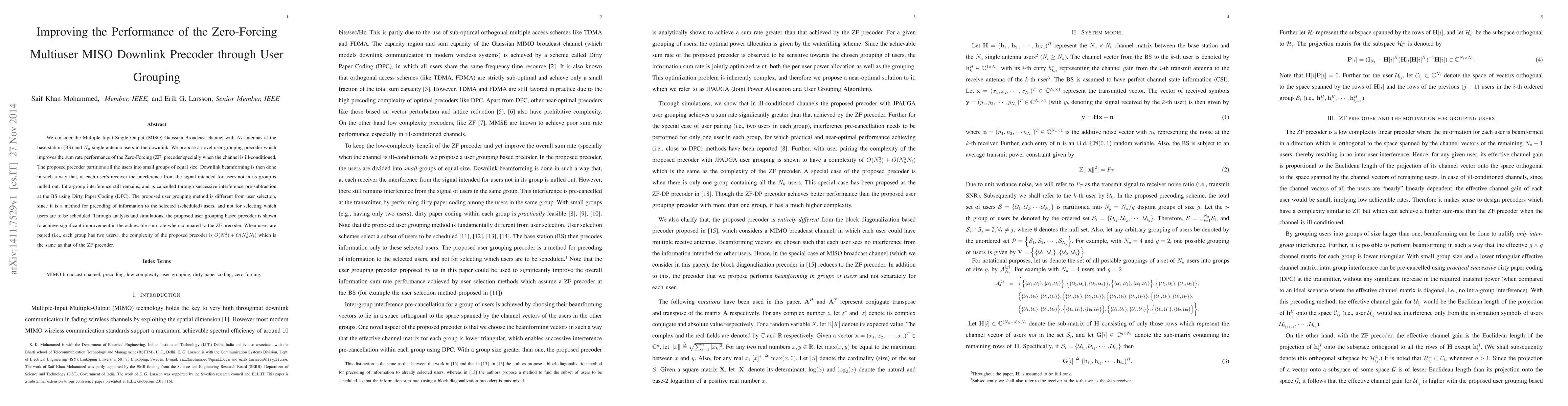 This paper proposes a novel user grouping precoder for MISO downlink to enhance the Zero-Forcing precoder's performance, especially under ill-conditioned channels. The method groups users into equal-sized sets and nulls interference from non-group signals, achieving significant sum rate improvements compared to ZF precoding.
