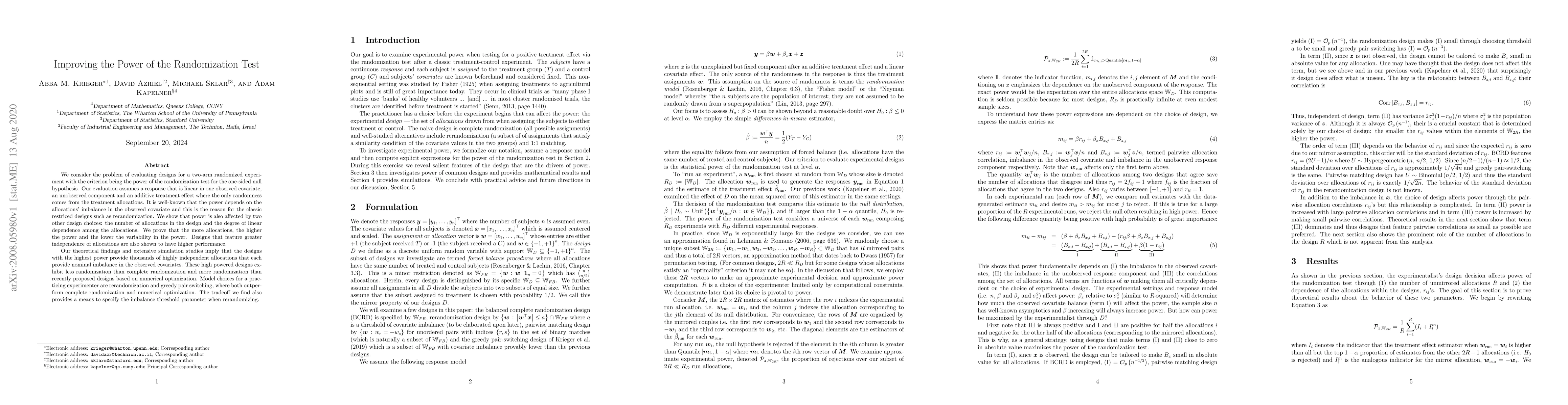 We consider the problem of evaluating designs for a two-arm randomized experiment with the criterion being the power of the randomization test for the one-sided null hypothesis. Our evaluation assumes a response that is linear in one observed covariate, an unobserved component and an additive treatment effect where the only randomness comes from the treatment allocations. It is well-known that the power depends on the allocations' imbalance in the observed covariate and this is the reason for the classic restricted designs such as rerandomization. We show that power is also affected by two other design choices: the number of allocations in the design and the degree of linear dependence among the allocations. We prove that the more allocations, the higher the power and the lower the variability in the power. Designs that feature greater independence of allocations are also shown to have higher performance. Our theoretical findings and extensive simulation studies imply that the designs with the highest power provide thousands of highly independent allocations that each provide nominal imbalance in the observed covariates. These high powered designs exhibit less randomization than complete randomization and more randomization than recently proposed designs based on numerical optimization. Model choices for a practicing experimenter are rerandomization and greedy pair switching, where both outperform complete randomization and numerical optimization. The tradeoff we find also provides a means to specify the imbalance threshold parameter when rerandomizing.