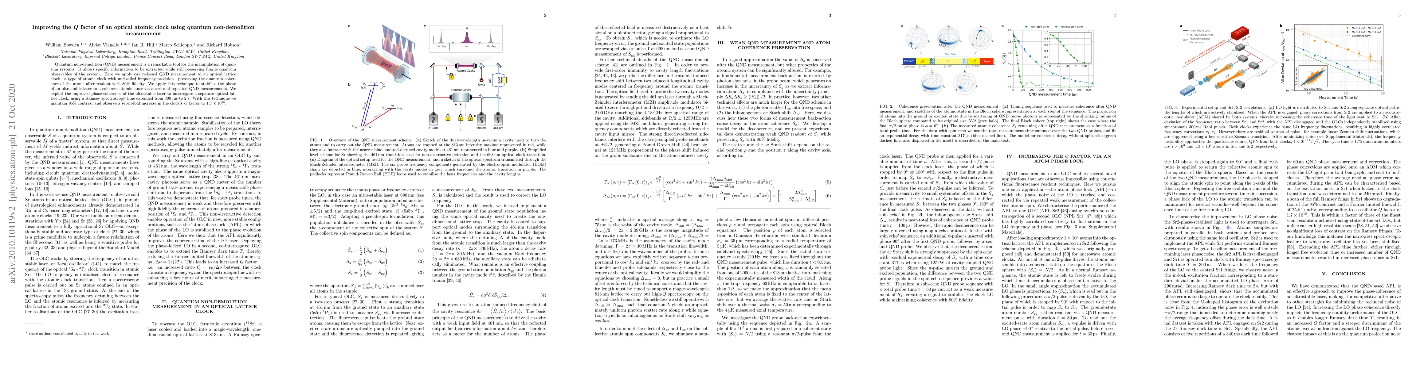 This paper demonstrates the use of quantum non-demolition measurement to enhance the Q factor of an optical atomic clock by preserving quantum coherence during readout, achieving a seven-fold increase to $1.7\times10^{15}$ and extending Ramsey spectroscopy time from 300 ms to 2 s.