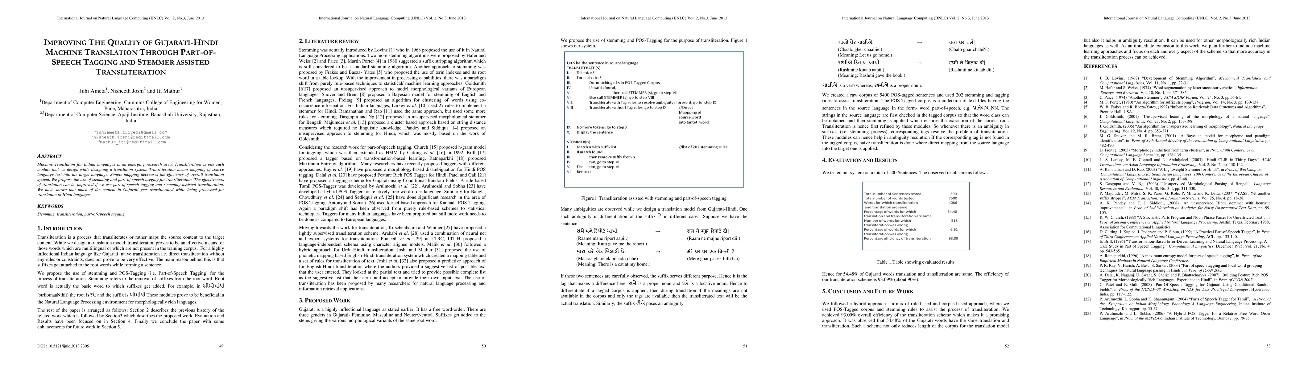Researchers propose using part-of-speech tagging and stemmer-assisted transliteration to improve Gujarati-Hindi machine translation, reducing errors in the process.