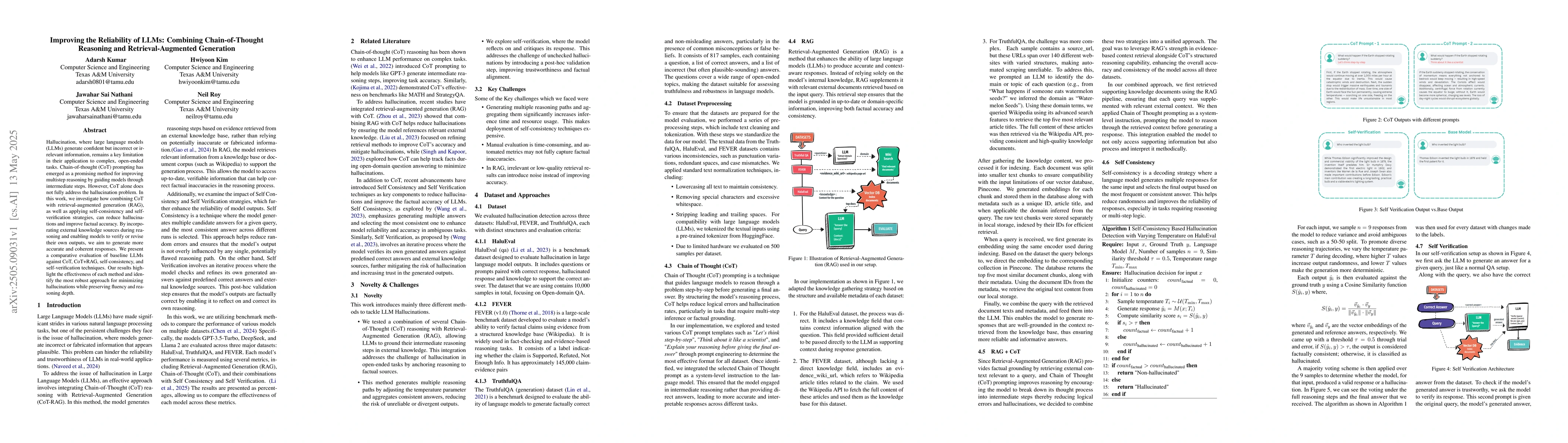 The research combines Chain-of-thought (CoT) prompting with Retrieval-Augmented Generation (RAG), and applies self-consistency and self-verification strategies to reduce hallucinations in LLMs. It evaluates baseline LLMs against CoT, CoT+RAG, self-consistency, and self-verification techniques.