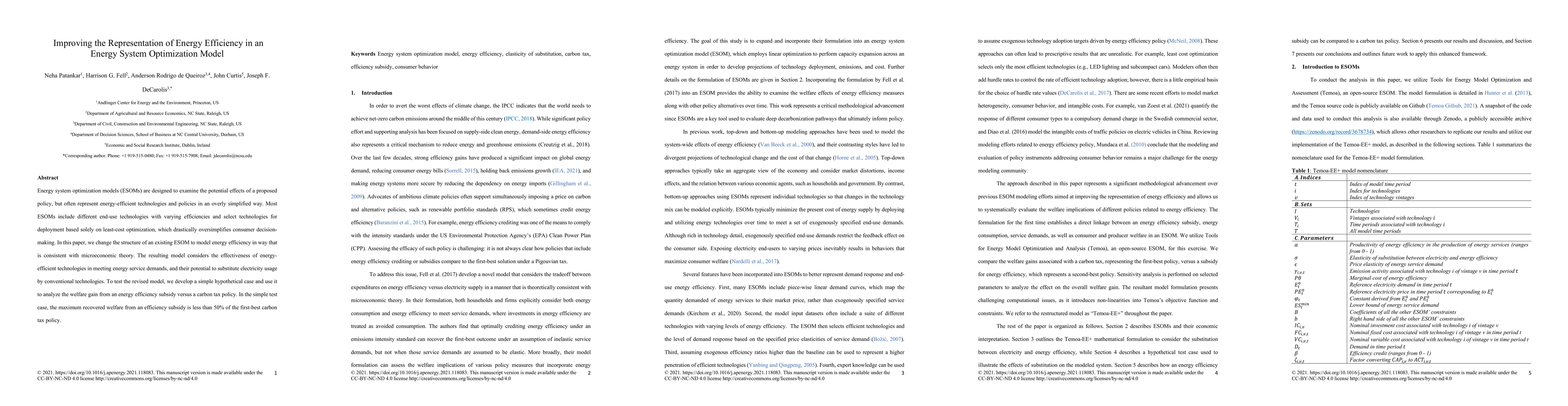 This paper revises an existing energy system optimization model to better represent energy efficiency in line with microeconomic theory, analyzing the welfare gains from an energy efficiency subsidy compared to a carbon tax policy in a hypothetical case. The results show that the efficiency subsidy yields less than half the welfare recovery of the carbon tax policy.