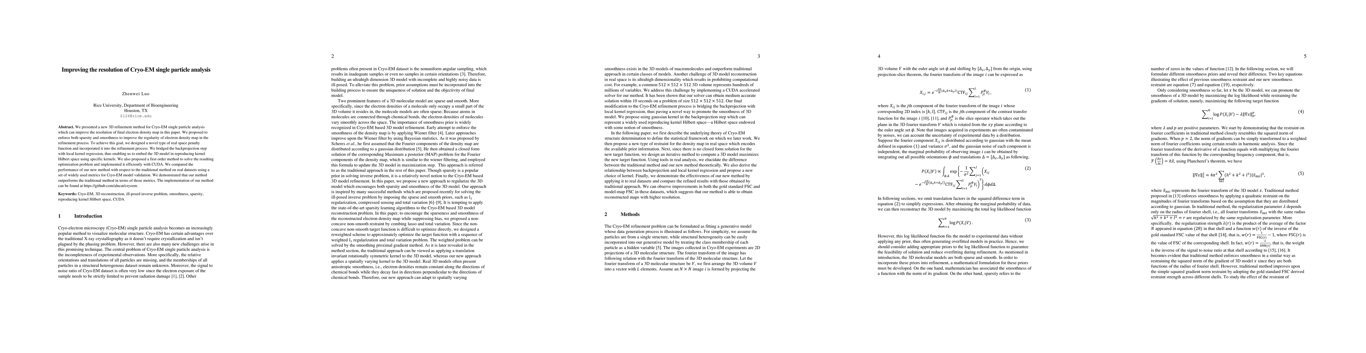 Researchers developed a new method to improve resolution in Cryo-EM single particle analysis by incorporating sparsity and smoothness, outperforming traditional methods in model validation metrics.