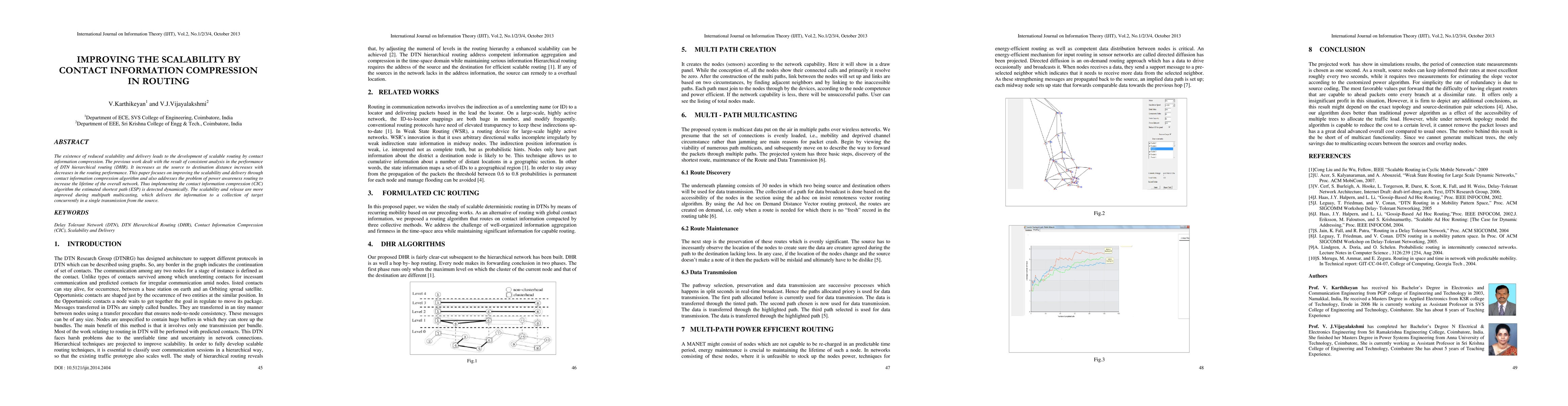 The existence of reduced scalability and delivery leads to the development of scalable routing by contact information compression. The previous work dealt with the result of consistent analysis in the performance of DTN hierarchical routing (DHR). It increases as the source to destination distance increases with decreases in the routing performance. This paper focuses on improving the scalability and delivery through contact information compression algorithm and also addresses the problem of power awareness routing to increase the lifetime of the overall network. Thus implementing the contact information compression (CIC) algorithm the estimated shortest path (ESP) is detected dynamically. The scalability and release are more improved during multipath multicasting, which delivers the information to a collection of target concurrently in a single transmission from the source