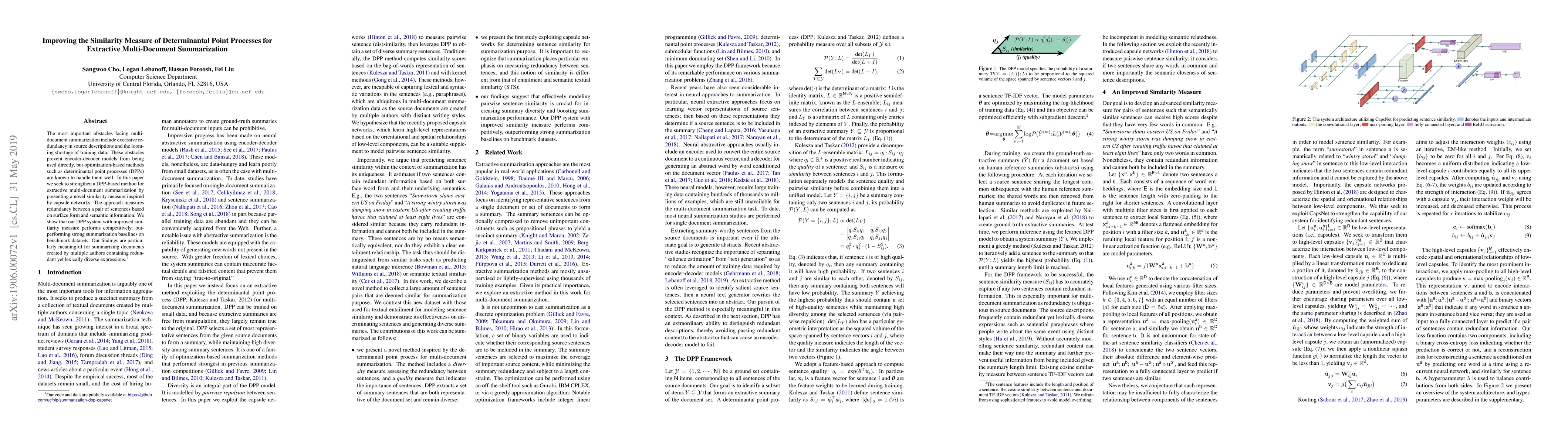This paper proposes a novel similarity measure for determinantal point processes (DPPs) to enhance extractive multi-document summarization, addressing redundancy and data scarcity. The new measure, inspired by capsule networks, captures both surface and semantic redundancy, leading to competitive summarization performance on benchmark datasets.
