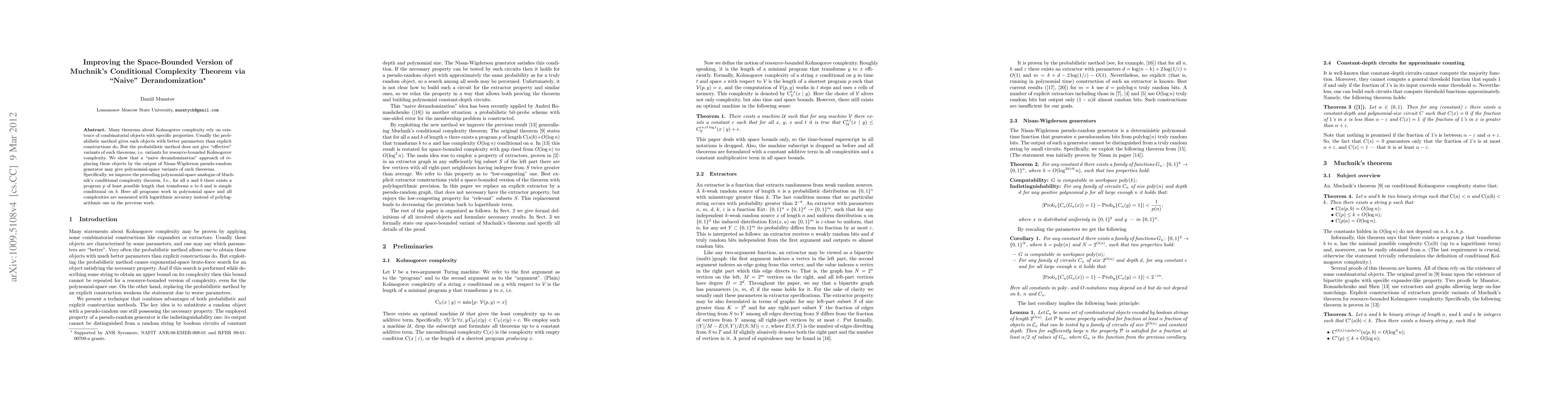Many theorems about Kolmogorov complexity rely on existence of combinatorial objects with specific properties. Usually the probabilistic method gives such objects with better parameters than explicit constructions do. But the probabilistic method does not give "effective" variants of such theorems, i.e. variants for resource-bounded Kolmogorov complexity. We show that a "naive derandomization" approach of replacing these objects by the output of Nisan-Wigderson pseudo-random generator may give polynomial-space variants of such theorems. Specifically, we improve the preceding polynomial-space analogue of Muchnik's conditional complexity theorem. I.e., for all $a$ and $b$ there exists a program $p$ of least possible length that transforms $a$ to $b$ and is simple conditional on $b$. Here all programs work in polynomial space and all complexities are measured with logarithmic accuracy instead of polylogarithmic one in the previous work.