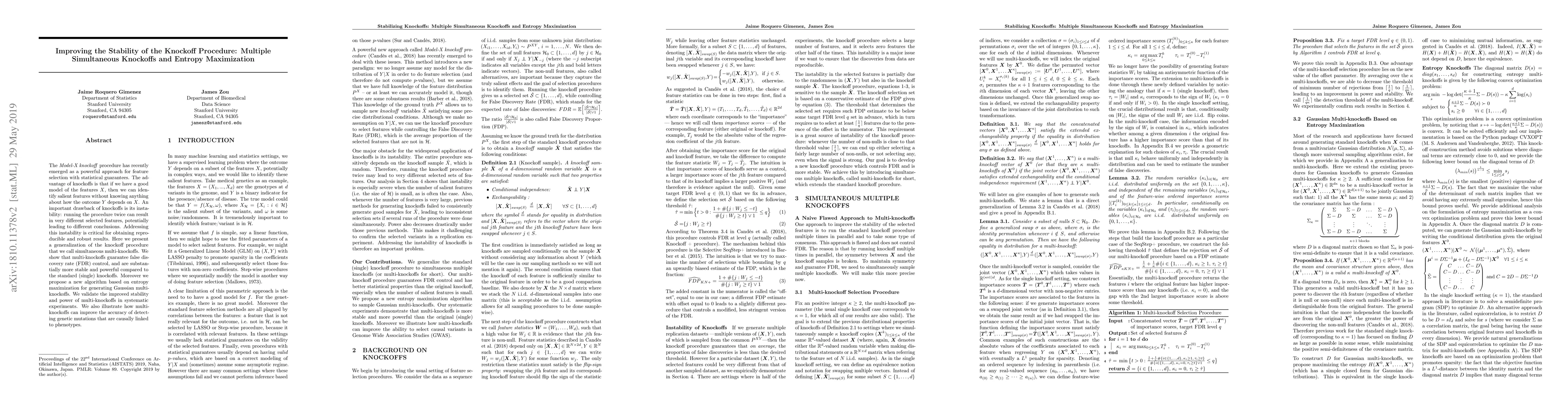 The Model-X knockoff procedure has recently emerged as a powerful approach for feature selection with statistical guarantees. The advantage of knockoff is that if we have a good model of the features X, then we can identify salient features without knowing anything about how the outcome Y depends on X. An important drawback of knockoffs is its instability: running the procedure twice can result in very different selected features, potentially leading to different conclusions. Addressing this instability is critical for obtaining reproducible and robust results. Here we present a generalization of the knockoff procedure that we call simultaneous multi-knockoffs. We show that multi-knockoff guarantees false discovery rate (FDR) control, and is substantially more stable and powerful compared to the standard (single) knockoff. Moreover we propose a new algorithm based on entropy maximization for generating Gaussian multi-knockoffs. We validate the improved stability and power of multi-knockoffs in systematic experiments. We also illustrate how multi-knockoffs can improve the accuracy of detecting genetic mutations that are causally linked to phenotypes.