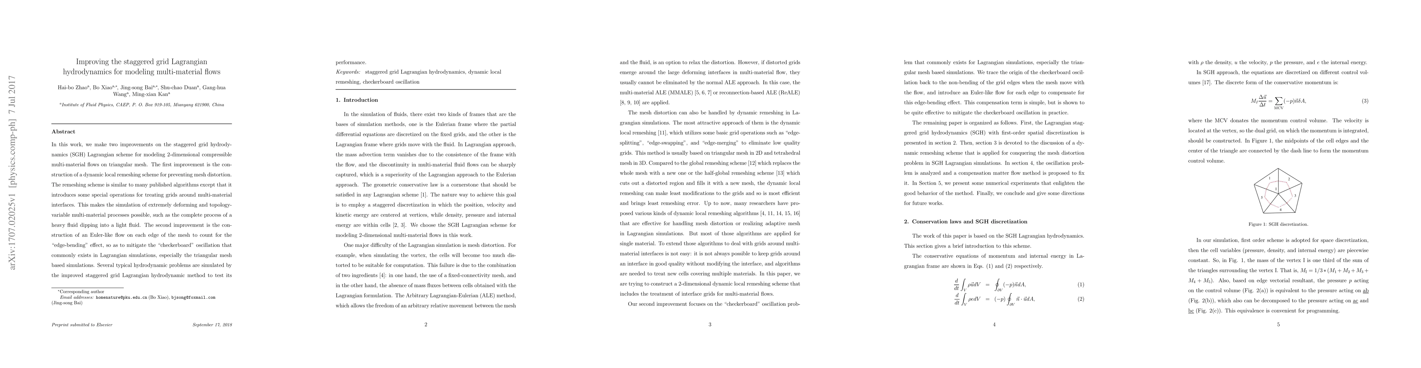 In this work, we make two improvements on the staggered grid hydrodynamics (SGH) Lagrangian scheme for modeling 2-dimensional compressible multi-material flows on triangular mesh. The first improvement is the construction of a dynamic local remeshing scheme for preventing mesh distortion. The remeshing scheme is similar to many published algorithms except that it introduces some special operations for treating grids around multi-material interfaces. This makes the simulation of extremely deforming and topology-variable multi-material processes possible, such as the complete process of a heavy fluid dipping into a light fluid. The second improvement is the construction of an Euler-like flow on each edge of the mesh to count for the "edge-bending" effect, so as to mitigate the "checkerboard" oscillation that commonly exists in Lagrangian simulations, especially the triangular mesh based simulations. Several typical hydrodynamic problems are simulated by the improved staggered grid Lagrangian hydrodynamic method to test its performance.