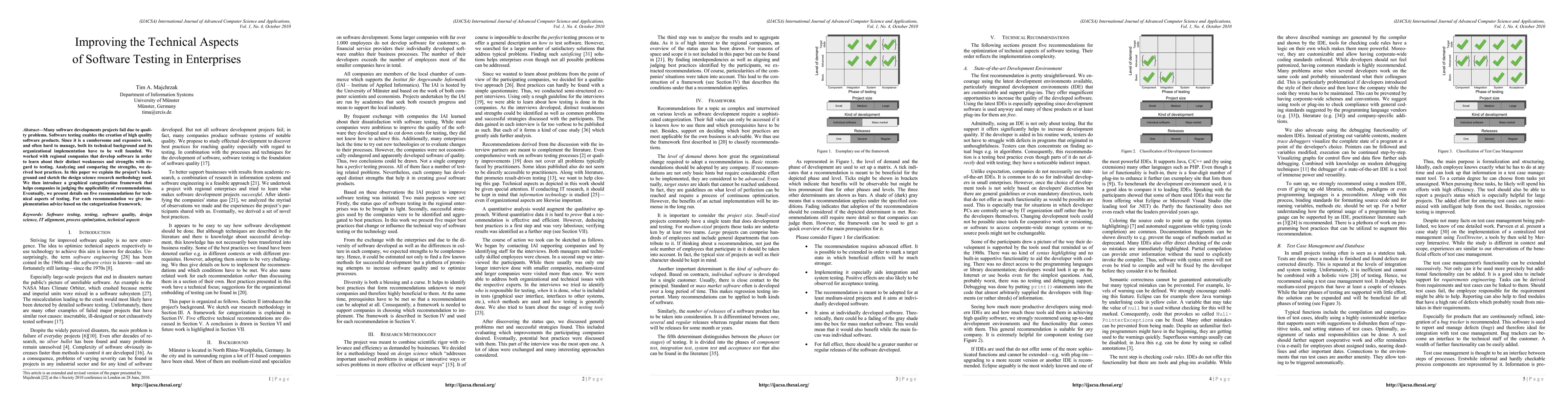 This paper investigates the technical aspects of software testing in enterprises, identifying weaknesses and strengths through collaboration with regional software development firms. It proposes a graphical categorization framework to assess the applicability of testing recommendations and outlines five technical testing improvements with implementation advice based on the framework.