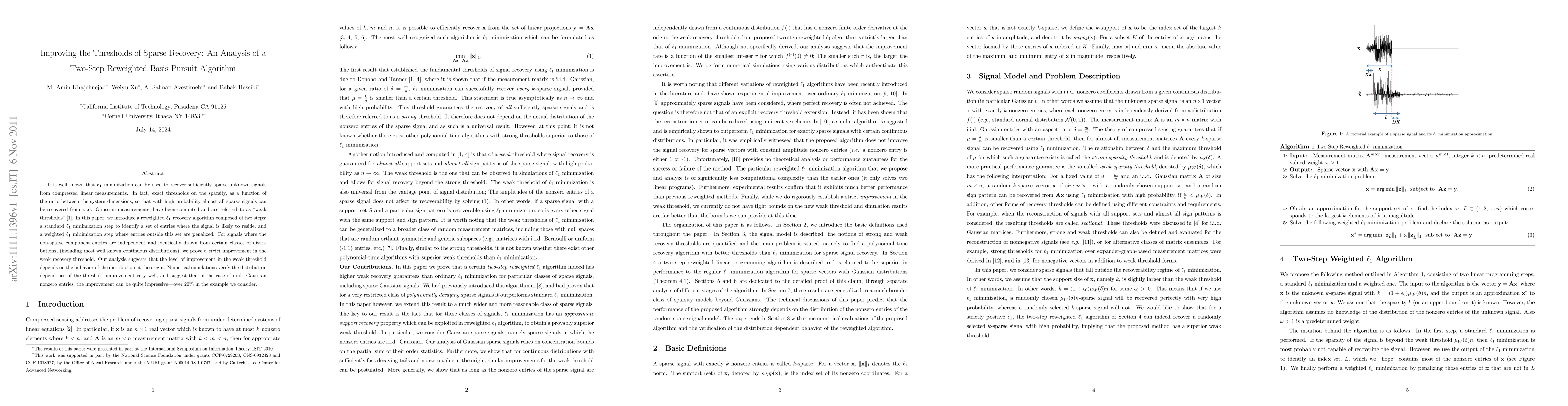 This paper proposes a two-step reweighted $\ell_1$ minimization algorithm to improve sparse signal recovery thresholds. The method enhances weak recovery thresholds by penalizing non-sparse components, showing significant improvement for signals with independent Gaussian entries, especially for distributions with specific behavior at the origin.