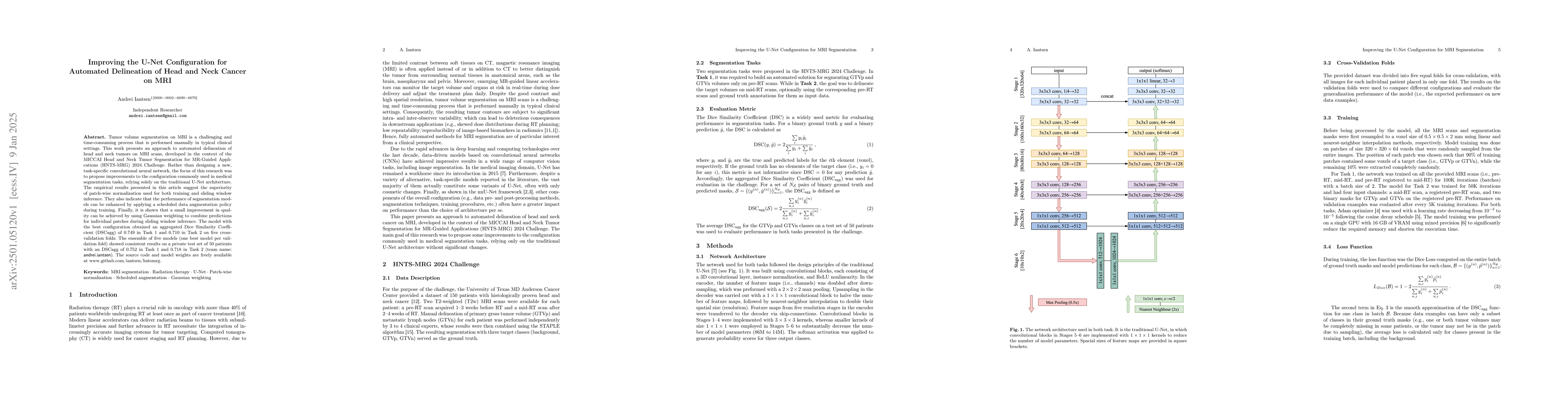 This research enhances the U-Net architecture for automated segmentation of head and neck tumors on MRI scans, achieving improved results through patch-wise normalization, scheduled data augmentation, and Gaussian weighting. The best model reached a Dice Similarity Coefficient of 0.749 in Task 1 and 0.710 in Task 2 on cross-validation, with an ensemble achieving 0.752 and 0.718 on a private test set.