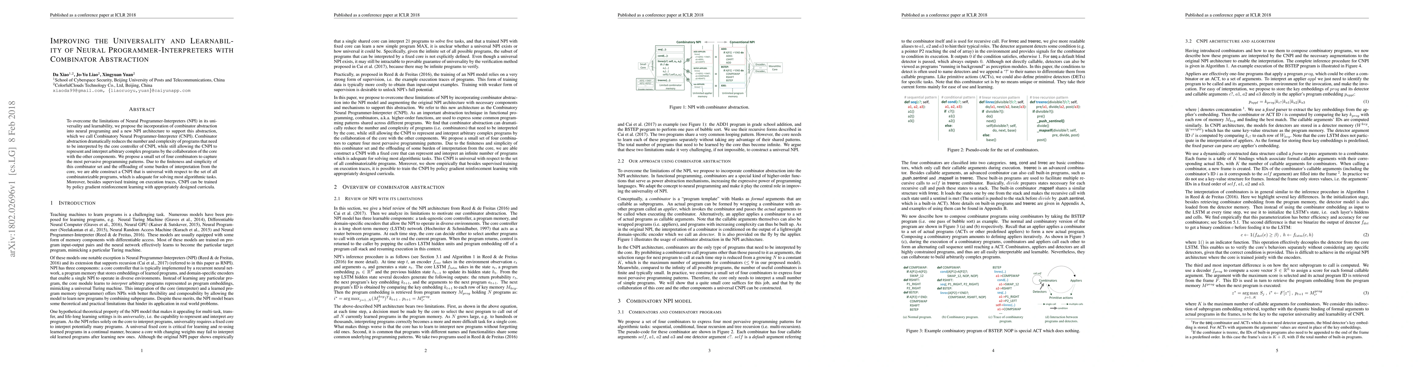 This paper proposes the Combinatory Neural Programmer-Interpreter (CNPI) to enhance the universality and learnability of Neural Programmer-Interpreters (NPI) by incorporating combinator abstraction. The CNPI architecture, supported by a small set of four combinators, reduces program complexity and enables the interpretation of complex programs while being universal for most algorithmic tasks.