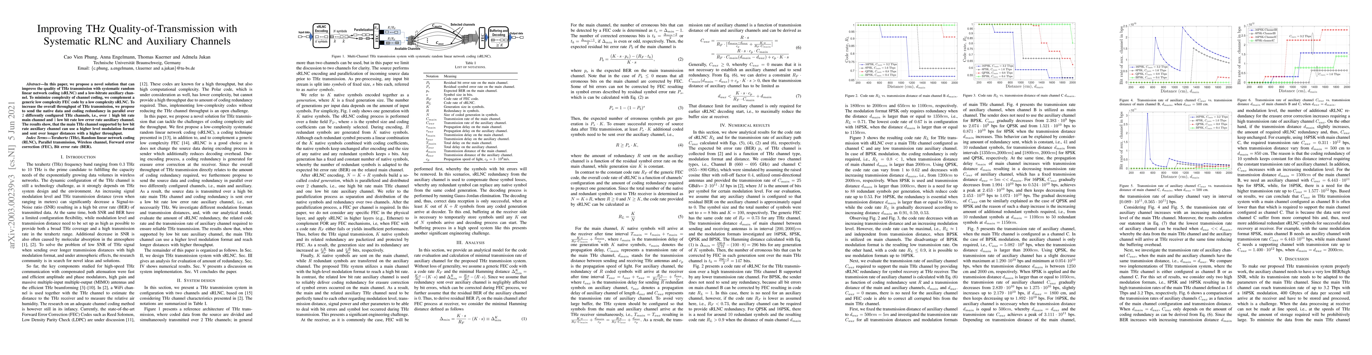 In this paper, we propose a novel solution that can improve the quality of THz transmission with systematic random linear network coding (sRLNC) and a low-bitrate auxiliary channel. To minimize complexity of channel coding, we complement a generic low complexity FEC code by a low complexity sRLNC. To increase the overall throughput of THz transmission, we propose to send the native data and coding redundancy in parallel over 2 differently configured THz channels, i.e., over 1 high bit rate main channel and 1 low bit rate low error rate auxiliary channel. The results show, that the main THz channel supported by low bit rate auxiliary channel can use a higher level modulation format and sent over longer distances with a higher throughput.