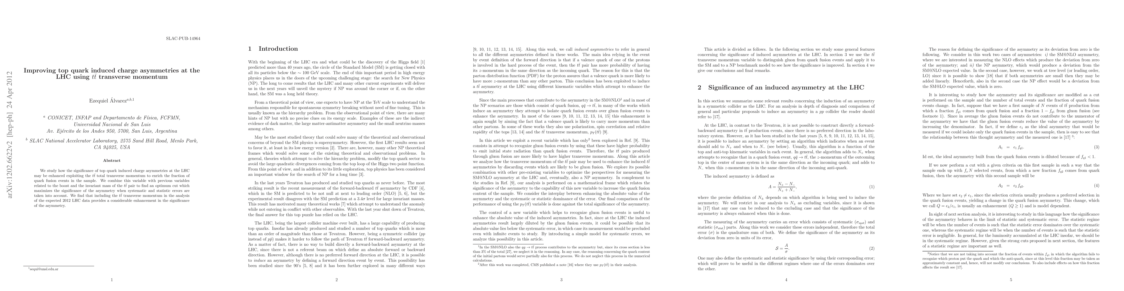 We study how the significance of top quark induced charge asymmetries at the LHC may be enhanced exploiting the $t\bar t$ total transverse momentum to enrich the fraction of quark fusion events in the sample. We combine this variable with previous variables related to the boost and the invariant mass of the $t\bar t$ pair to find an optimum cut which maximizes the significance of the asymmetry when systematic and statistic errors are taken into account. We find that including the $t\bar t$ transverse momentum in the analysis of the expected 2012 LHC data provides a considerable enhancement in the significance of the asymmetry.