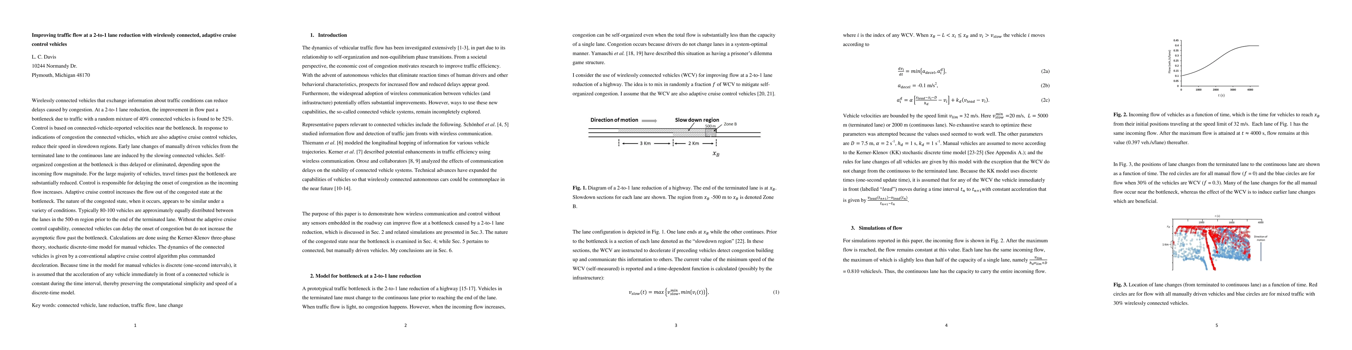 This study finds that wirelessly connected adaptive cruise control vehicles can significantly improve traffic flow at a 2-to-1 lane reduction, reducing congestion delays by 52% with a 40% mix of connected vehicles. The adaptive cruise control and connected vehicle information help delay or eliminate self-organized congestion, substantially reducing travel times for most vehicles.