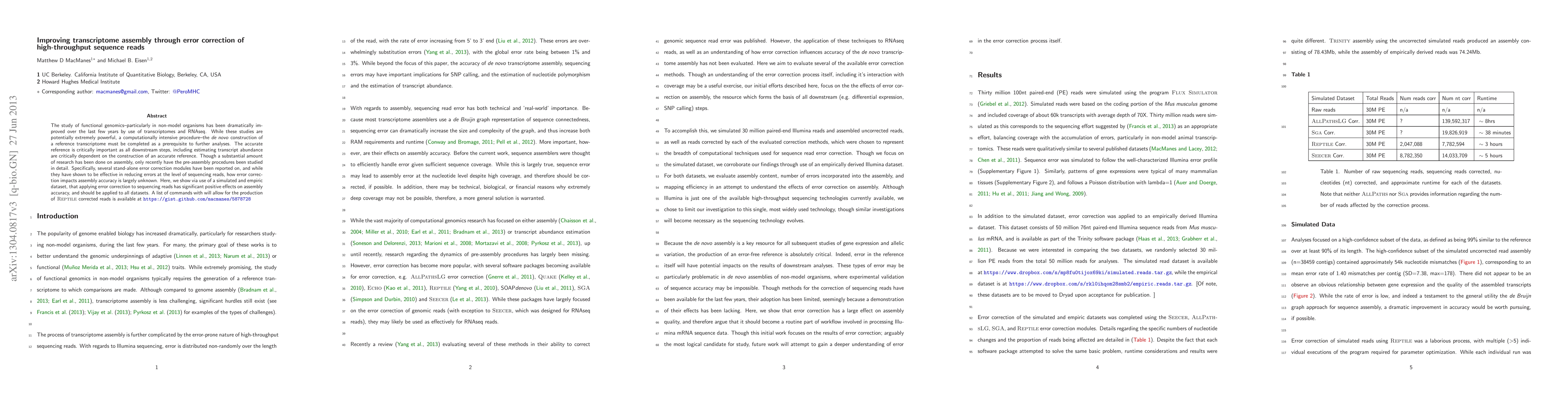 This paper demonstrates that applying error correction to high-throughput sequence reads significantly improves transcriptome assembly accuracy, reducing assembly errors by nearly 50%. The study suggests that pre-assembly error correction should be a standard procedure in functional genomics research.