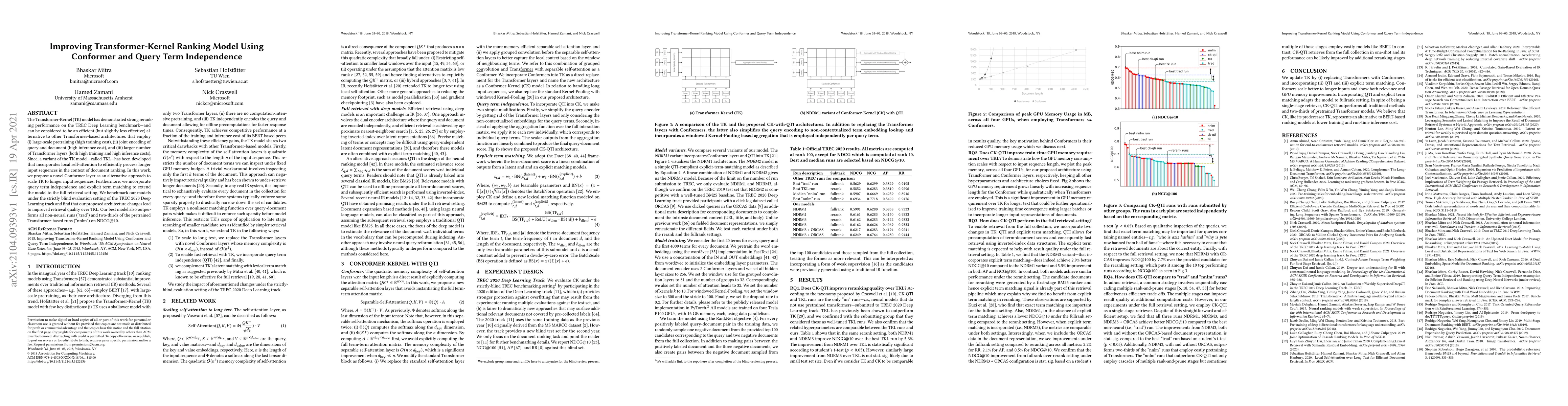 This paper proposes a Conformer layer to enhance the Transformer-Kernel model for better handling of long input sequences and introduces query term independence and explicit term matching for full retrieval settings. Benchmarked on TREC 2020, the new model shows improved retrieval quality over previous versions and outperforms non-neural and many pretrained Transformer-based models.
