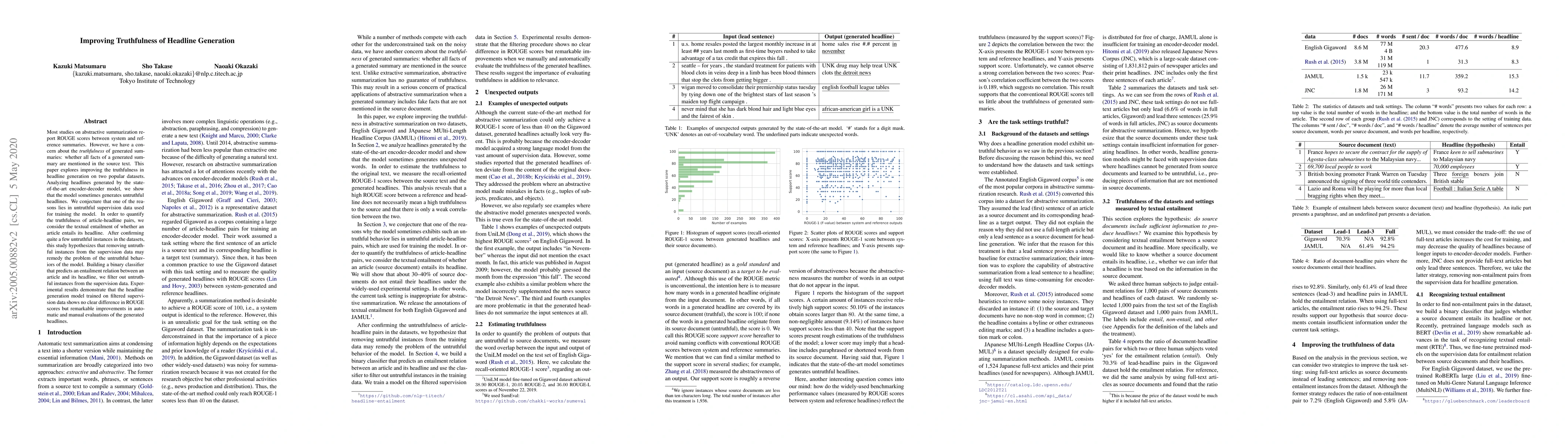 This paper investigates the issue of untruthfulness in generated headlines by analyzing state-of-the-art models and proposes a method to improve truthfulness by filtering out untruthful instances from the training data. The results show significant improvements in the accuracy of generated headlines without compromising summarization quality.