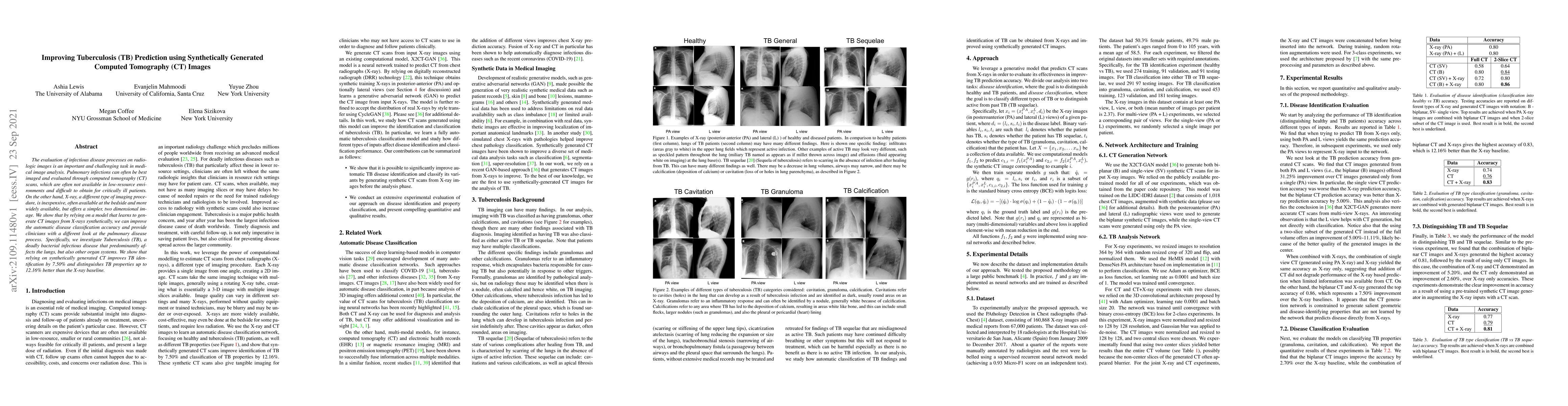 The evaluation of infectious disease processes on radiologic images is an important and challenging task in medical image analysis. Pulmonary infections can often be best imaged and evaluated through computed tomography (CT) scans, which are often not available in low-resource environments and difficult to obtain for critically ill patients. On the other hand, X-ray, a different type of imaging procedure, is inexpensive, often available at the bedside and more widely available, but offers a simpler, two dimensional image. We show that by relying on a model that learns to generate CT images from X-rays synthetically, we can improve the automatic disease classification accuracy and provide clinicians with a different look at the pulmonary disease process. Specifically, we investigate Tuberculosis (TB), a deadly bacterial infectious disease that predominantly affects the lungs, but also other organ systems. We show that relying on synthetically generated CT improves TB identification by 7.50% and distinguishes TB properties up to 12.16% better than the X-ray baseline.
