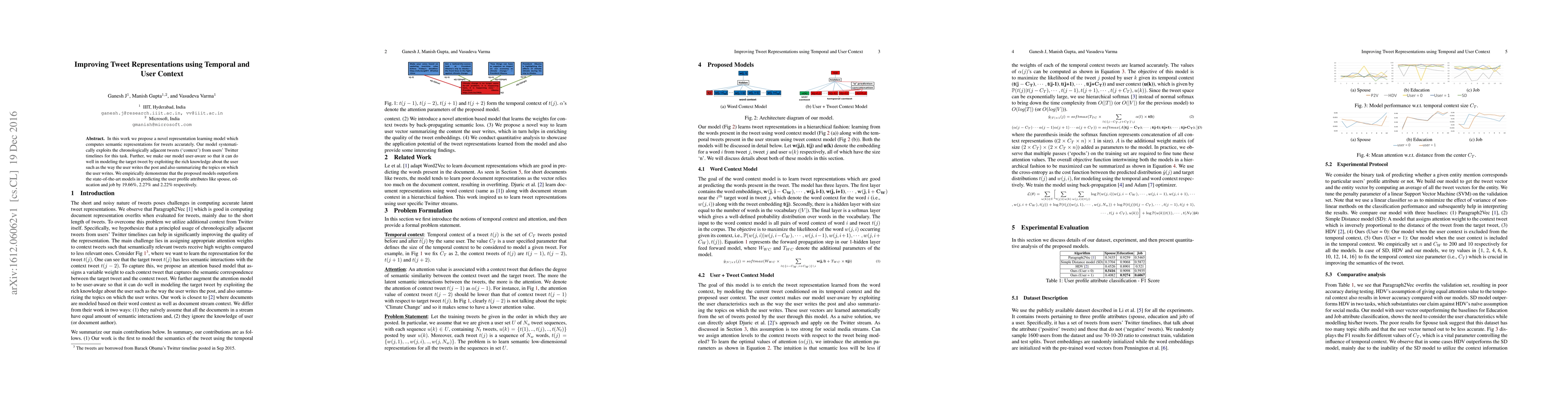 This paper proposes a novel representation learning model that leverages both temporal context from adjacent tweets and user-specific context to accurately represent tweets. The model outperforms existing methods in predicting user profile attributes such as spouse, education, and job.