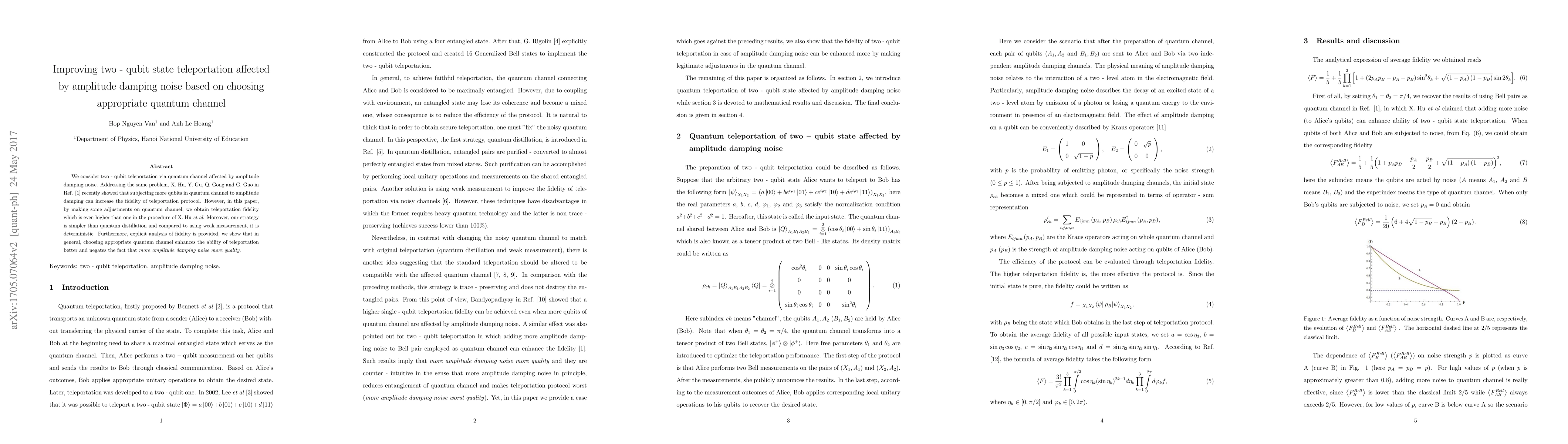 We consider two qubit teleportation via quantum channel affected by amplitude damping noise. Addressing the same problem, X. Hu, Y. Gu, Q. Gong and G. Guo [Phys. Rev. A 81, 054302, (2010)] recently showed that in presence of noise, subjecting more qubits in quantum channel to amplitude damping can increase the fidelity of teleportation protocol. However, in this paper, by making some adjustments on quantum channel, we obtain teleportation fidelity which is even higher than one in the case of X. Hu et al. Moreover, our strategy is simpler than quantum distillation and compared to using weak measurement, it is deterministic. Furthermore, explicit analysis of fidelity is provided, we show that in general, choosing appropriate quantum channel enhances the ability of teleportation better and negates the fact that more amplitude damping noise more quality.