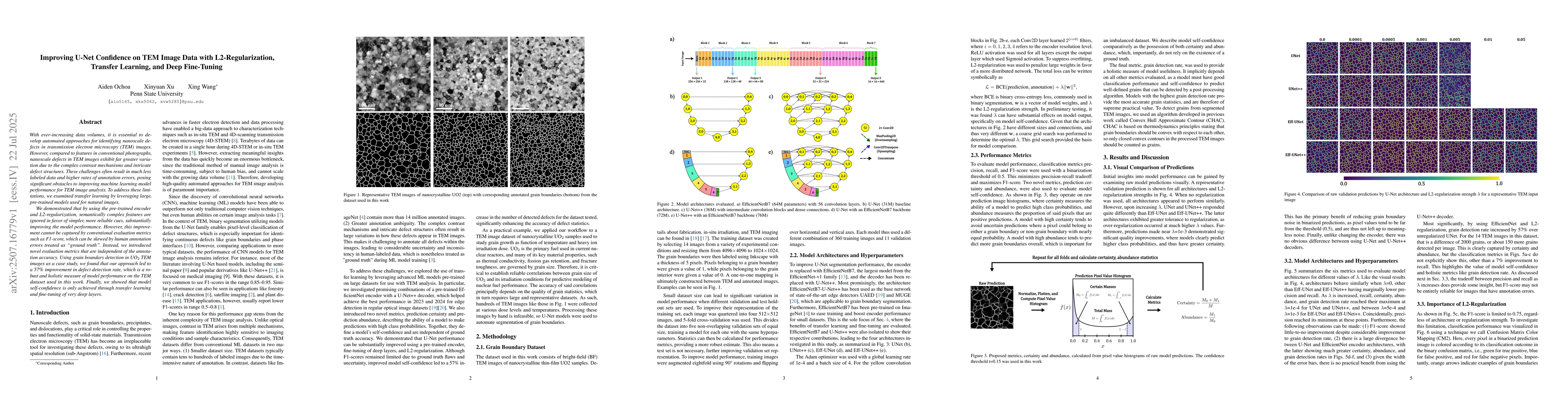 With ever-increasing data volumes, it is essential to develop automated approaches for identifying nanoscale defects in transmission electron microscopy (TEM) images. However, compared to features in conventional photographs, nanoscale defects in TEM images exhibit far greater variation due to the complex contrast mechanisms and intricate defect structures. These challenges often result in much less labeled data and higher rates of annotation errors, posing significant obstacles to improving machine learning model performance for TEM image analysis. To address these limitations, we examined transfer learning by leveraging large, pre-trained models used for natural images. We demonstrated that by using the pre-trained encoder and L2-regularization, semantically complex features are ignored in favor of simpler, more reliable cues, substantially improving the model performance. However, this improvement cannot be captured by conventional evaluation metrics such as F1-score, which can be skewed by human annotation errors treated as ground truth. Instead, we introduced novel evaluation metrics that are independent of the annotation accuracy. Using grain boundary detection in UO2 TEM images as a case study, we found that our approach led to a 57% improvement in defect detection rate, which is a robust and holistic measure of model performance on the TEM dataset used in this work. Finally, we showed that model self-confidence is only achieved through transfer learning and fine-tuning of very deep layers.