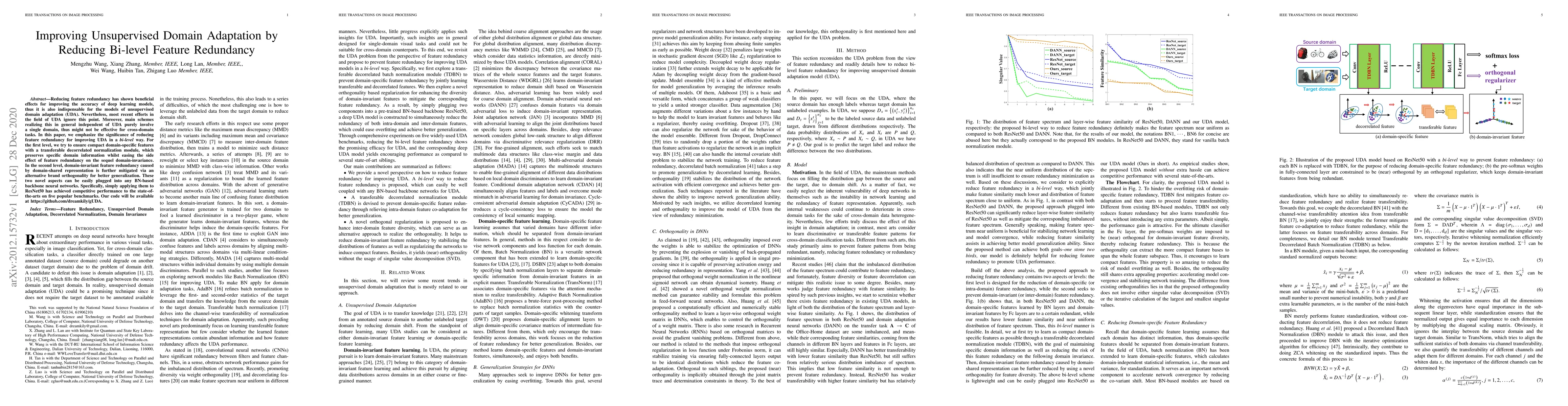 This paper proposes a novel approach to improving unsupervised domain adaptation by reducing feature redundancy, achieving competitive performance on five popular benchmarks.