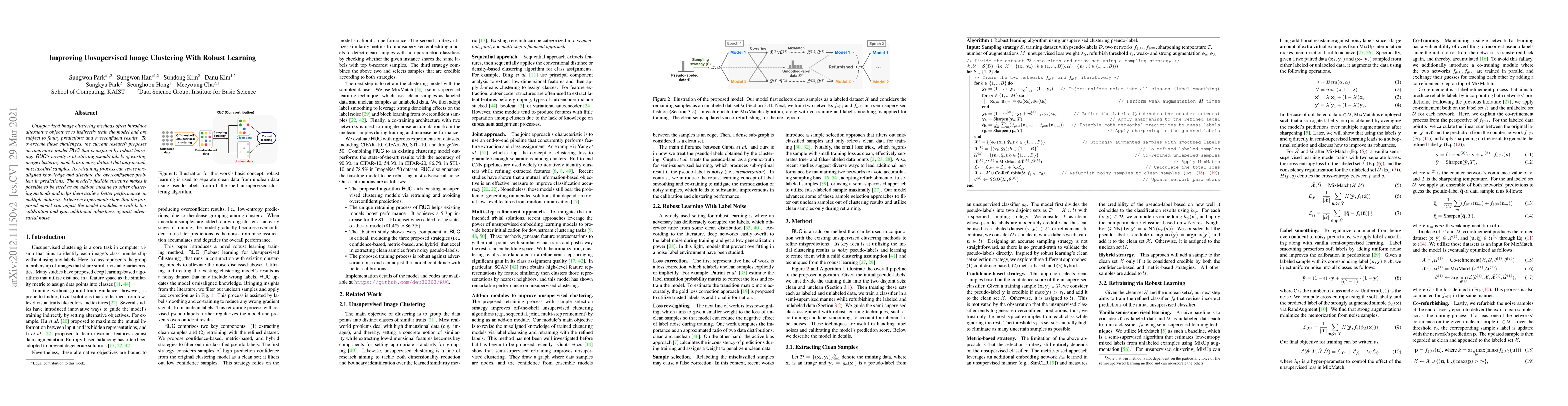 The paper proposes RUC, an unsupervised image clustering model inspired by robust learning, which uses pseudo-labels from existing models to correct misaligned knowledge and reduce overconfidence. RUC enhances the performance of other clustering methods and demonstrates improved calibration and robustness against adversarial noise.