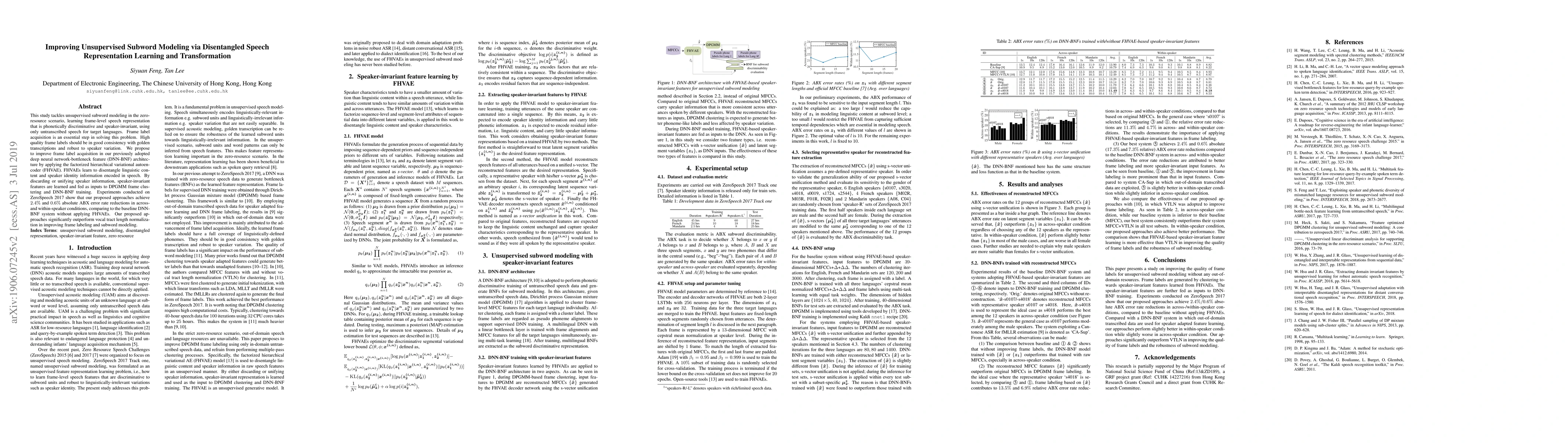 This study enhances unsupervised subword modeling in zero-resource scenarios by learning speaker-invariant speech representations using a factorized hierarchical variational autoencoder (FHVAE) to disentangle linguistic content from speaker identity. The proposed method achieves notable reductions in ABX error rates, outperforming traditional vocal tract length normalization.