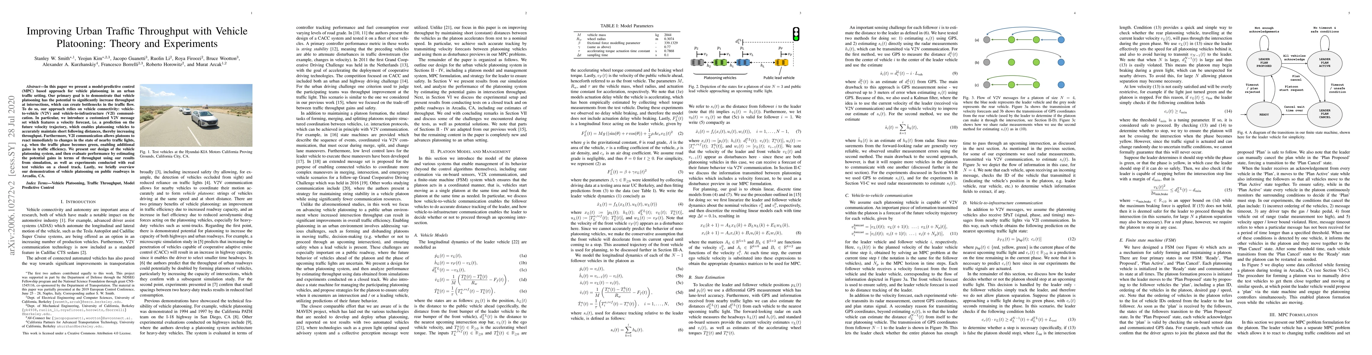 This paper proposes a model-predictive control-based vehicle platooning system to enhance urban traffic throughput at intersections. The system leverages V2V and V2I communication to maintain short distances and react to traffic light changes, demonstrated through simulations and real-world tests.