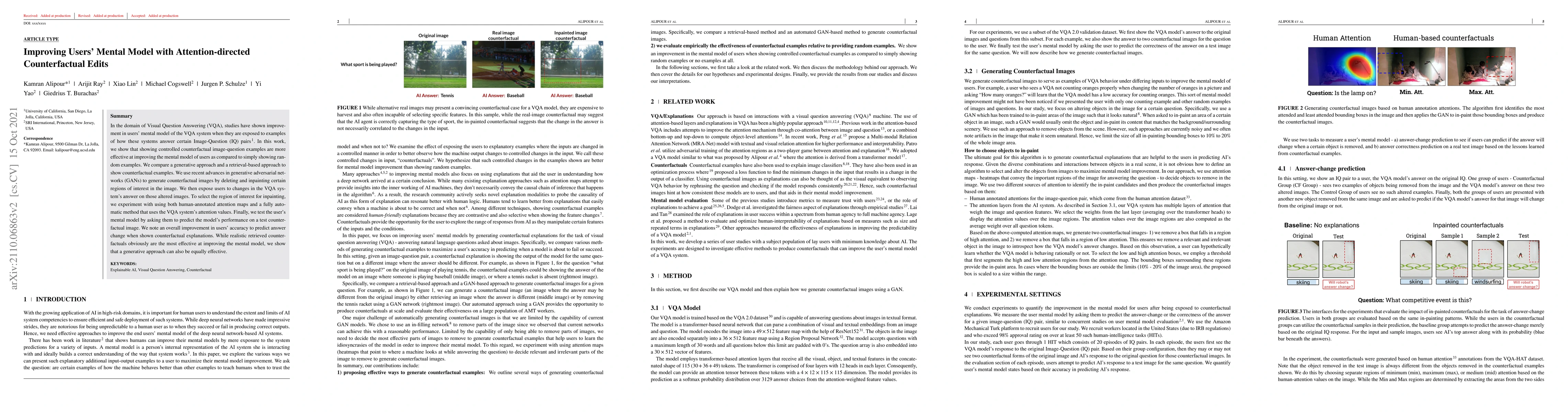This research demonstrates that counterfactual image-question examples, especially those directed by attention mechanisms, significantly enhance users' mental models of Visual Question Answering systems compared to random examples. Both generative and retrieval-based approaches show improved prediction accuracy in users when exposed to these counterfactuals, highlighting the effectiveness of attention-directed edits.