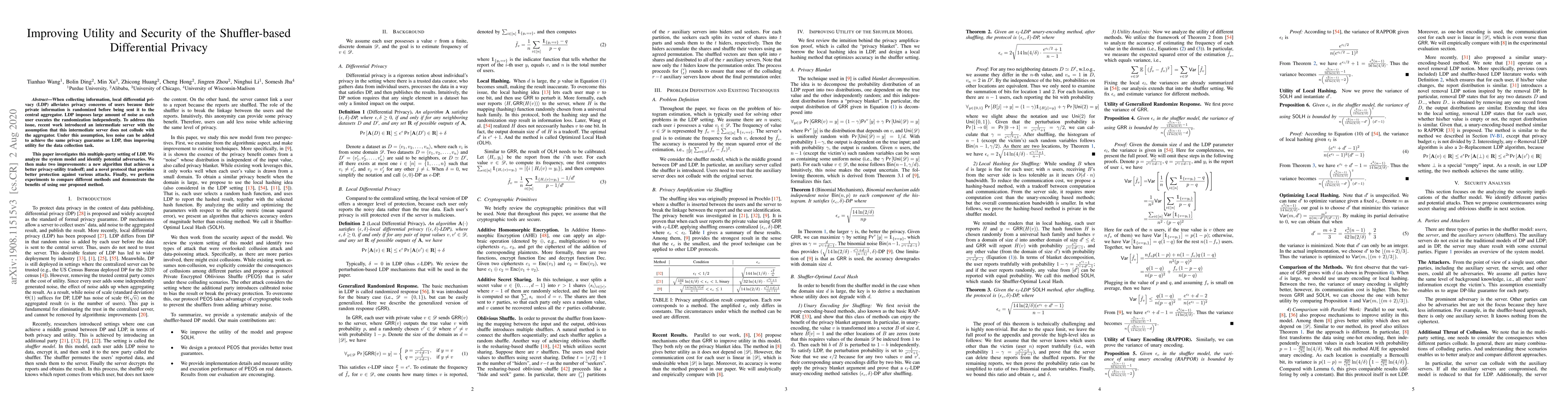 When collecting information, local differential privacy (LDP) alleviates privacy concerns of users because their private information is randomized before being sent it to the central aggregator. LDP imposes large amount of noise as each user executes the randomization independently. To address this issue, recent work introduced an intermediate server with the assumption that this intermediate server does not collude with the aggregator. Under this assumption, less noise can be added to achieve the same privacy guarantee as LDP, thus improving utility for the data collection task. This paper investigates this multiple-party setting of LDP. We analyze the system model and identify potential adversaries. We then make two improvements: a new algorithm that achieves a better privacy-utility tradeoff; and a novel protocol that provides better protection against various attacks. Finally, we perform experiments to compare different methods and demonstrate the benefits of using our proposed method.