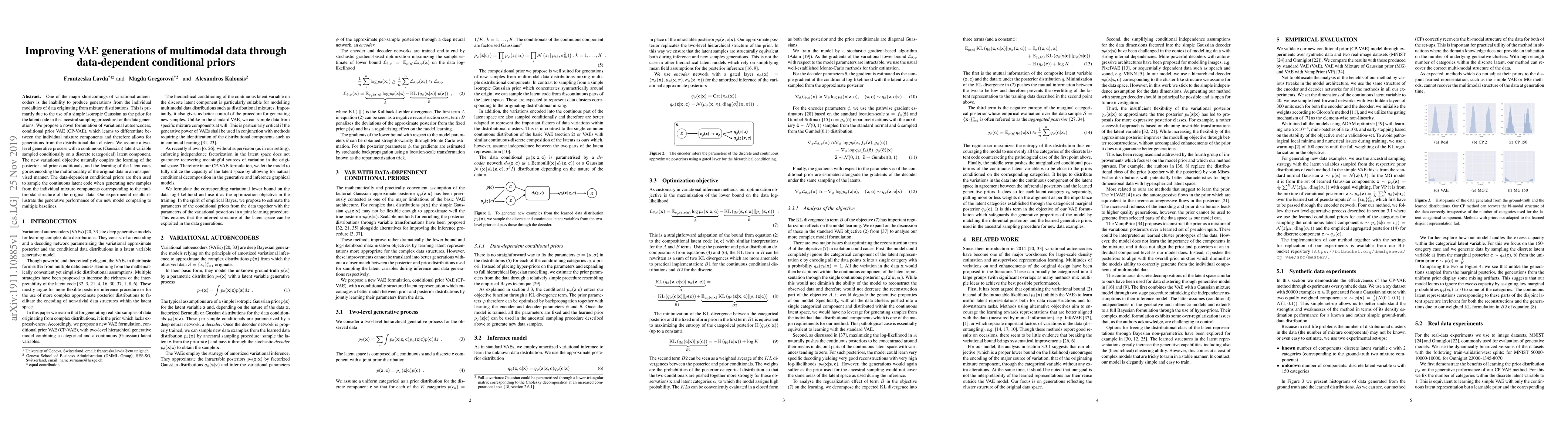 This paper proposes a Conditional Prior Variational Autoencoder (CP-VAE) to improve generation of multimodal data by using data-dependent conditional priors. The CP-VAE learns to differentiate between mixture components, enabling generation from individual data clusters, outperforming baseline models in experimental results.