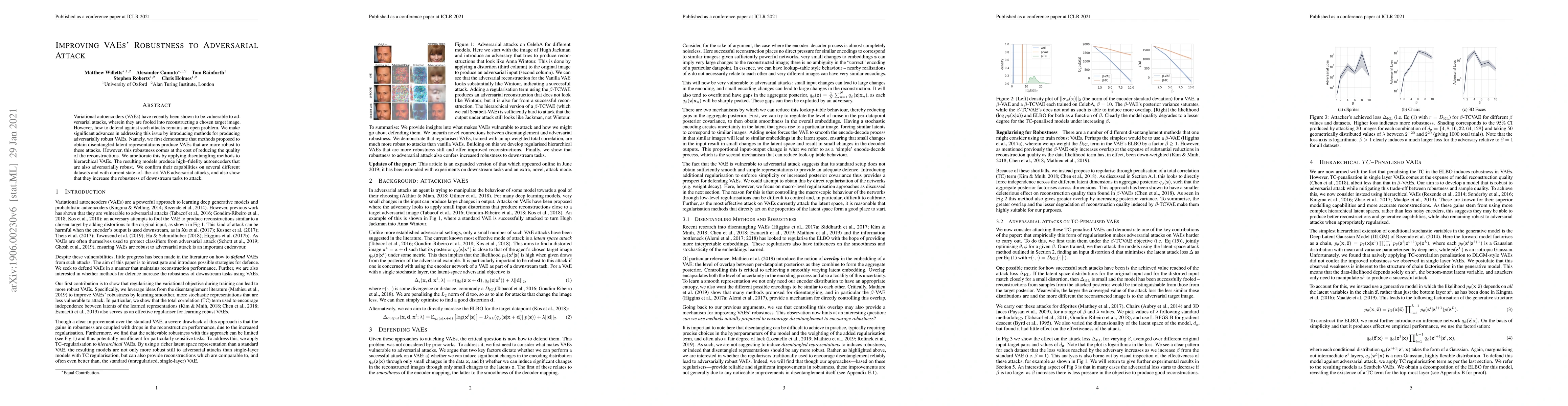 This paper introduces methods to enhance the robustness of variational autoencoders (VAEs) against adversarial attacks, demonstrating that disentangled latent representations improve attack resilience but reduce reconstruction quality. The authors propose applying disentangling techniques to hierarchical VAEs to achieve both high-quality reconstructions and adversarial robustness, validated across various datasets and attack methods.