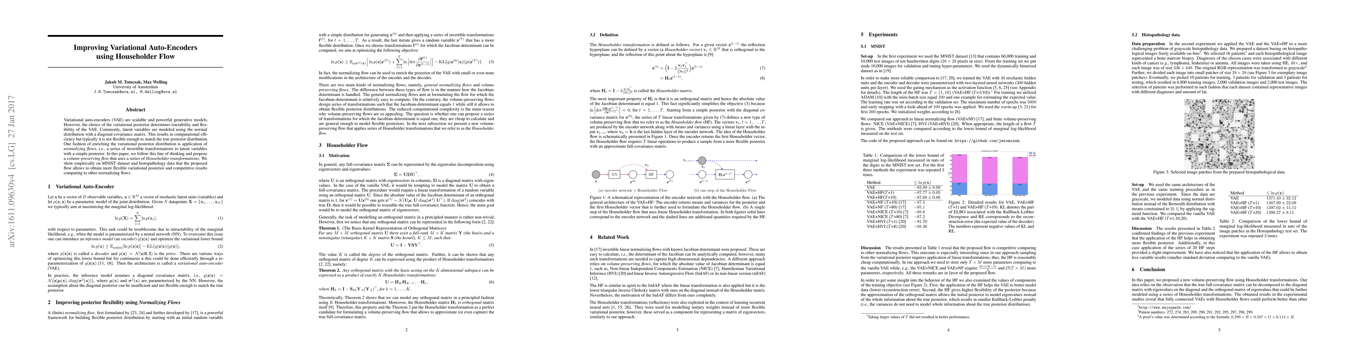This paper proposes a variational auto-encoder (VAE) enhanced with a series of Householder transformations to create a more flexible variational posterior. Empirical results on MNIST and histopathology data show that this approach achieves competitive generative performance compared to other normalizing flows.