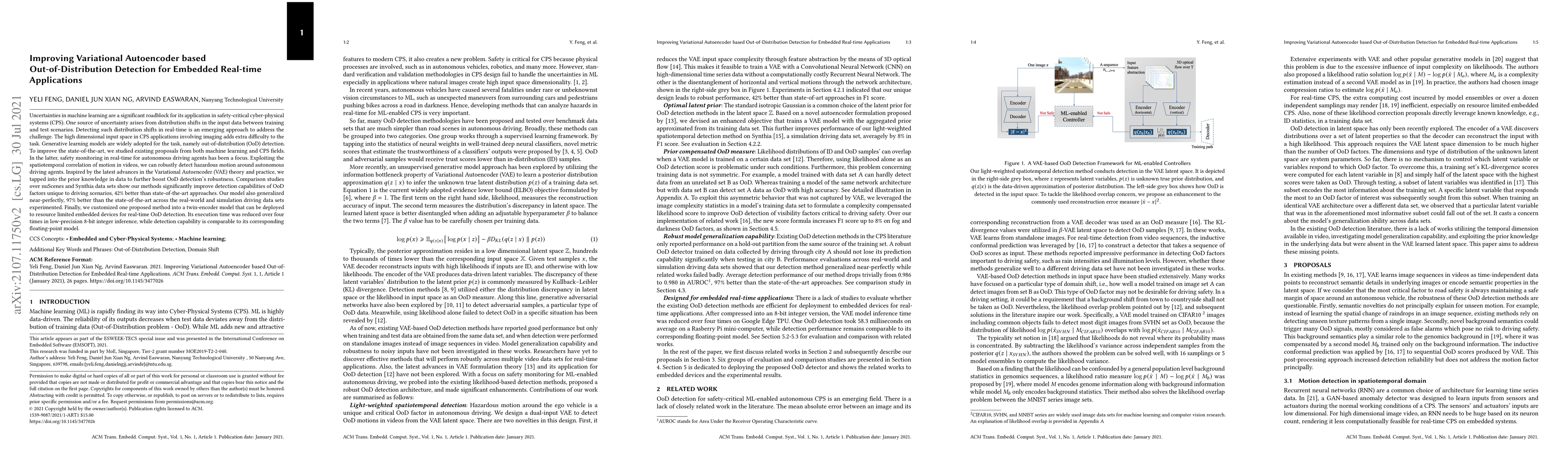 Uncertainties in machine learning are a significant roadblock for its application in safety-critical cyber-physical systems (CPS). One source of uncertainty arises from distribution shifts in the input data between training and test scenarios. Detecting such distribution shifts in real-time is an emerging approach to address the challenge. The high dimensional input space in CPS applications involving imaging adds extra difficulty to the task. Generative learning models are widely adopted for the task, namely out-of-distribution (OoD) detection. To improve the state-of-the-art, we studied existing proposals from both machine learning and CPS fields. In the latter, safety monitoring in real-time for autonomous driving agents has been a focus. Exploiting the spatiotemporal correlation of motion in videos, we can robustly detect hazardous motion around autonomous driving agents. Inspired by the latest advances in the Variational Autoencoder (VAE) theory and practice, we tapped into the prior knowledge in data to further boost OoD detection's robustness. Comparison studies over nuScenes and Synthia data sets show our methods significantly improve detection capabilities of OoD factors unique to driving scenarios, 42% better than state-of-the-art approaches. Our model also generalized near-perfectly, 97% better than the state-of-the-art across the real-world and simulation driving data sets experimented. Finally, we customized one proposed method into a twin-encoder model that can be deployed to resource limited embedded devices for real-time OoD detection. Its execution time was reduced over four times in low-precision 8-bit integer inference, while detection capability is comparable to its corresponding floating-point model.